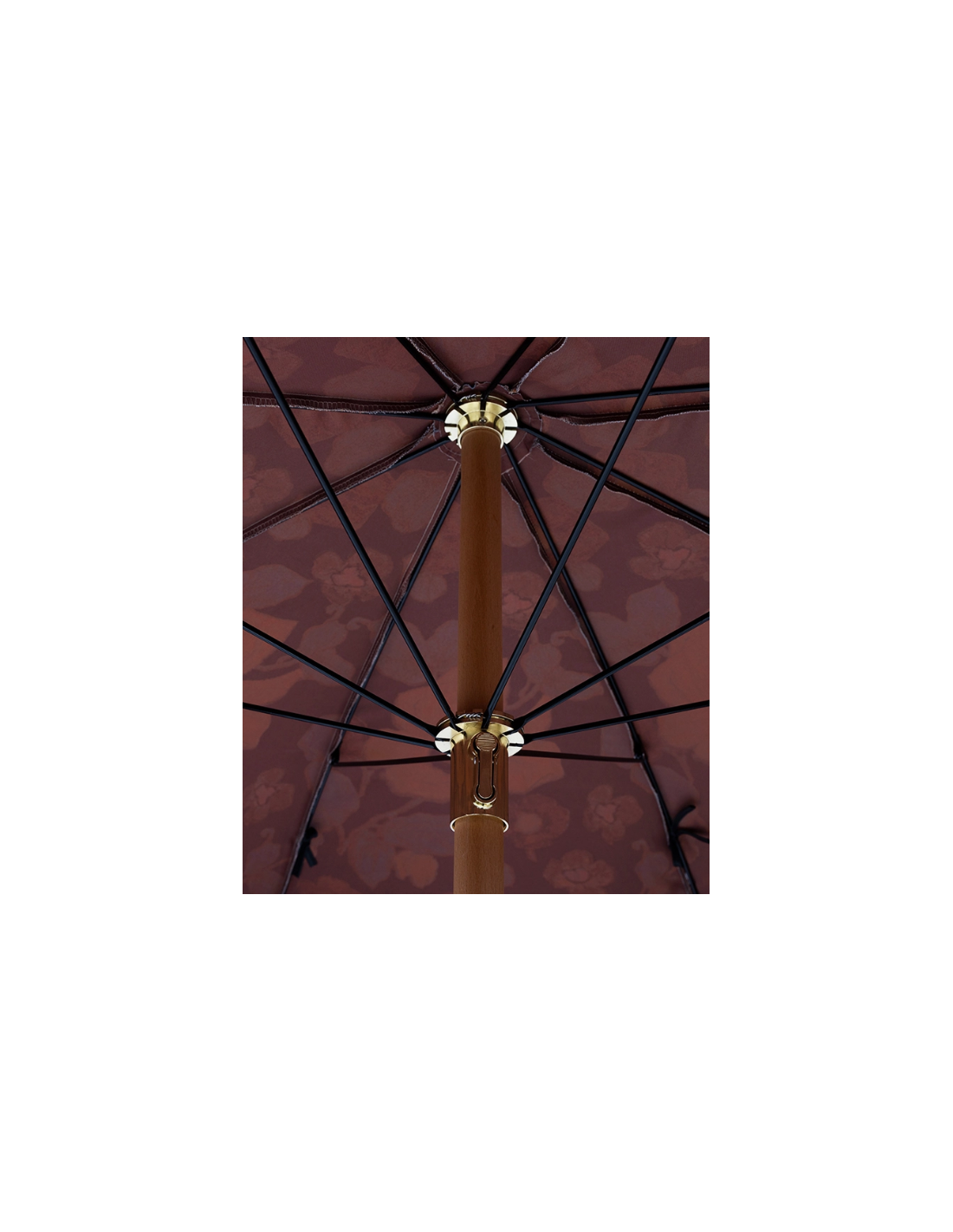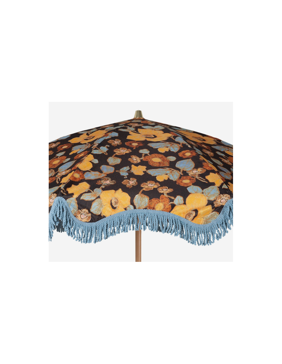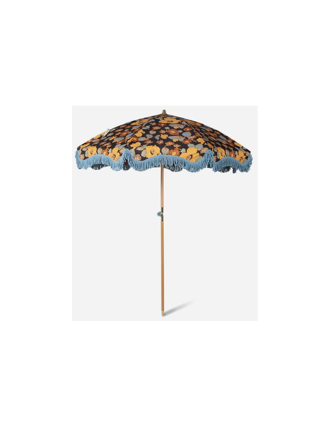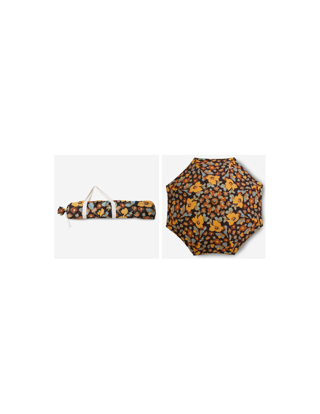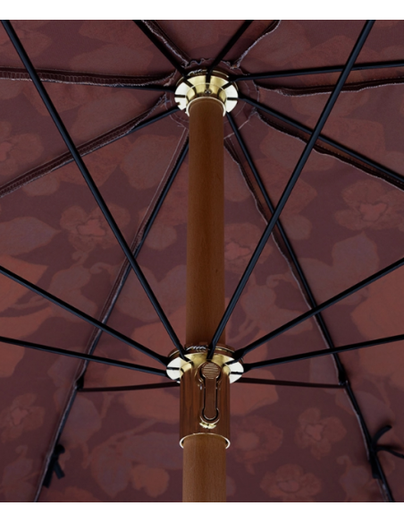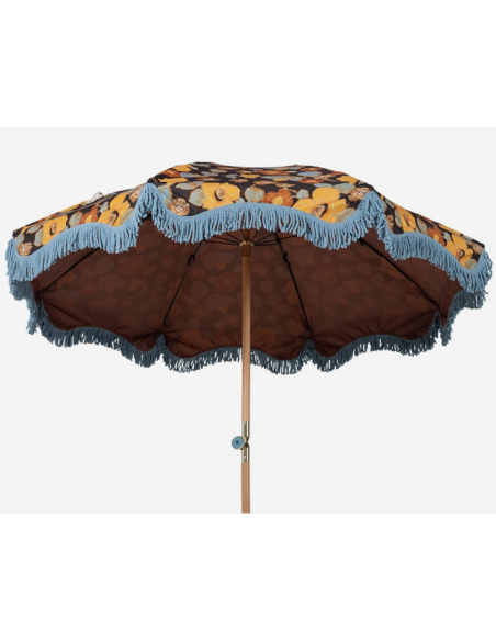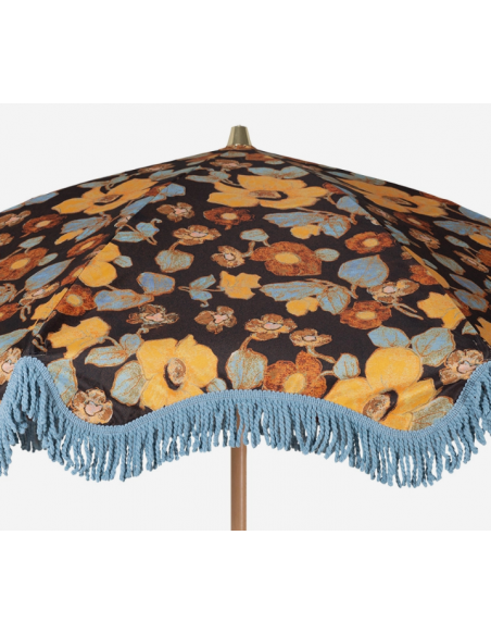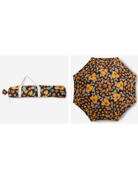 Strandparasol udført i et sandt retropræget design, i blomstret polyester. Stangen er udført i solid bøgetræ og med kipfunktion. Parasollen måler 200 cm i skærmdiameter og 230 cm i højden.