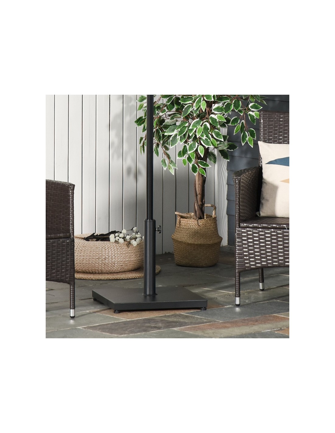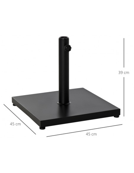 Parasolfod 18 kg i metal. Parasolfoden måler 45 x 45 cm i bredde og dybde og 39 cm i højden. Foden kommer med holdere til parasoller med stangdiameter 3,5 cm/3,8 cm.