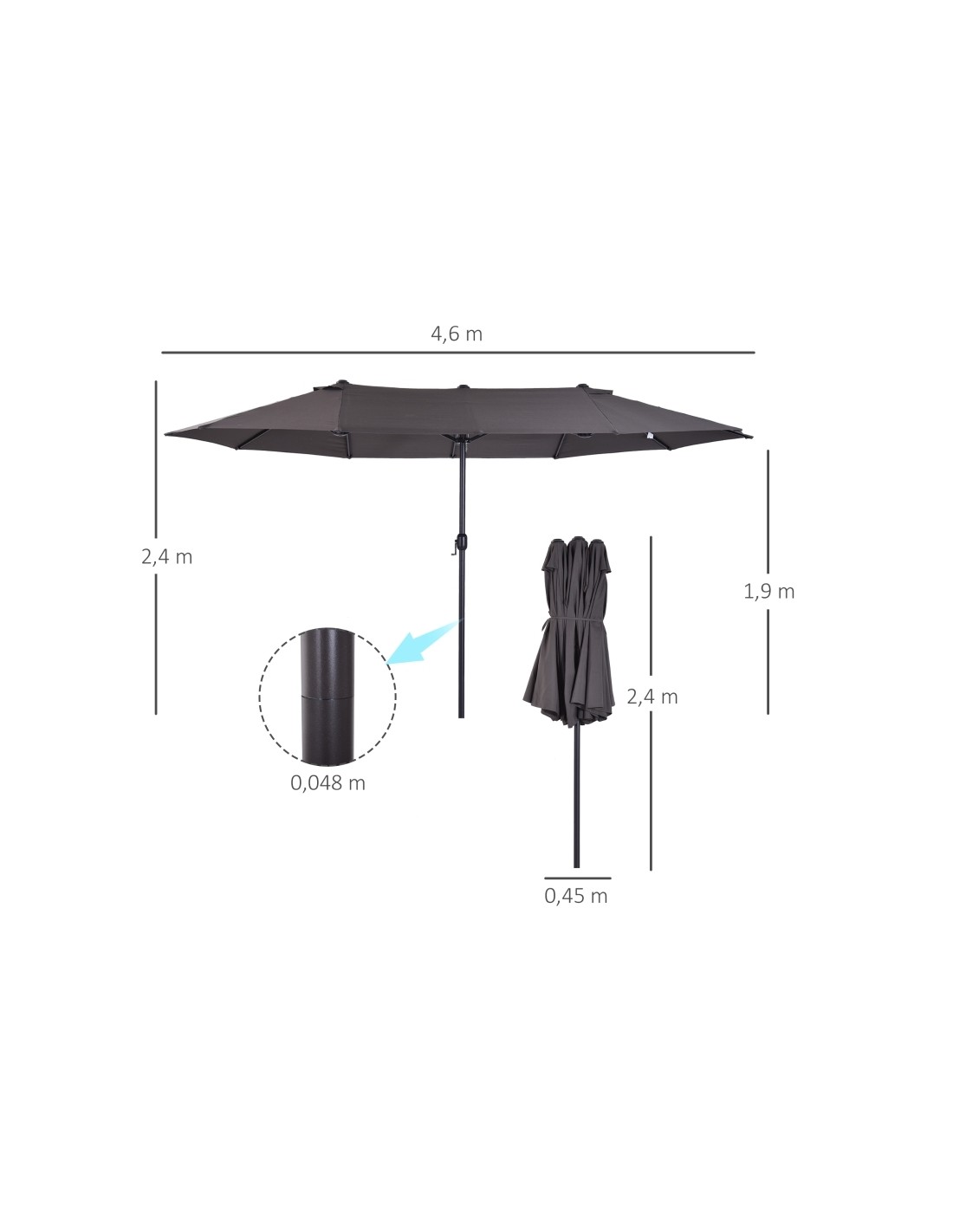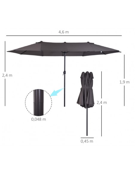 Oval parasol udført i metal og polyester. Parasollen måler 460 x 270 cm i diameter og 240 cm i højden. Bemærk venligst, at fod ikke medfølger.
