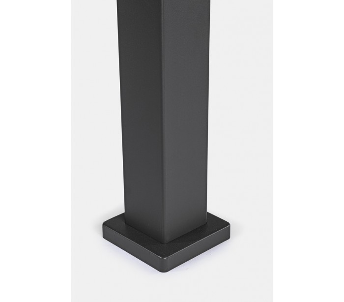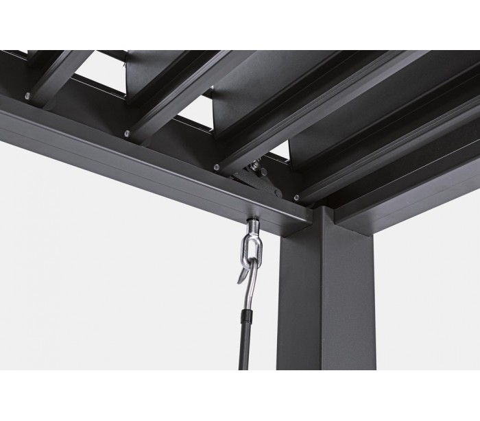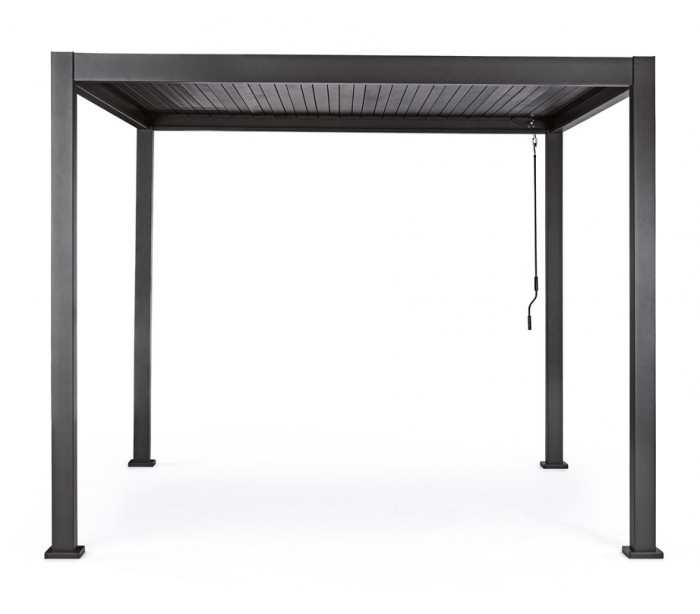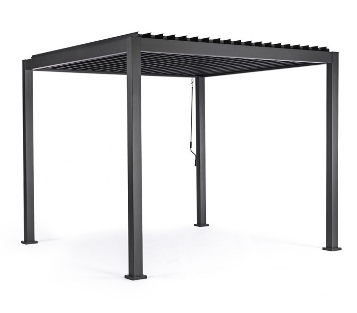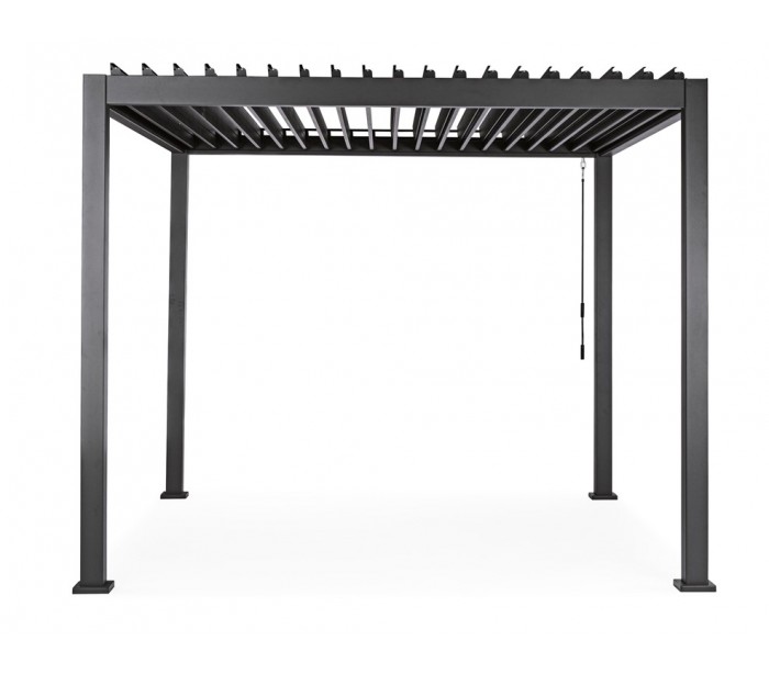 Pavillion med vippetag udført i et design af pulverlakeret aluminium. Pavillionen måler 250 cm i højden og 300 x 300 cm i bredde og dybde. Der er integreret vandafledning i de lodrette stænger.