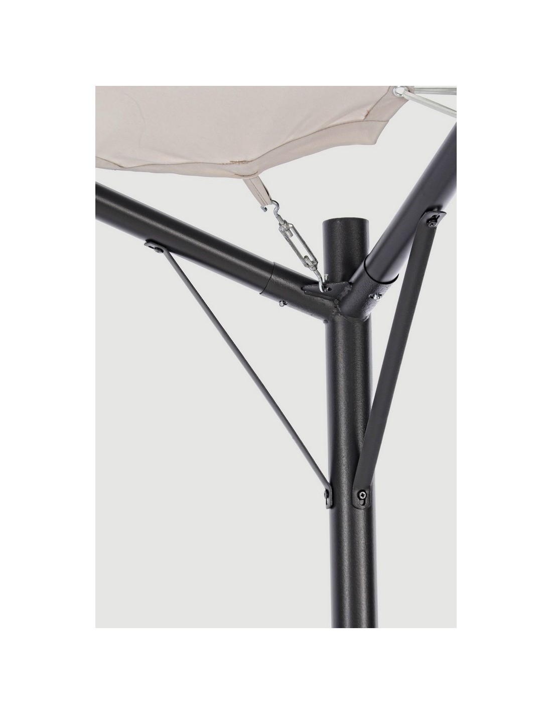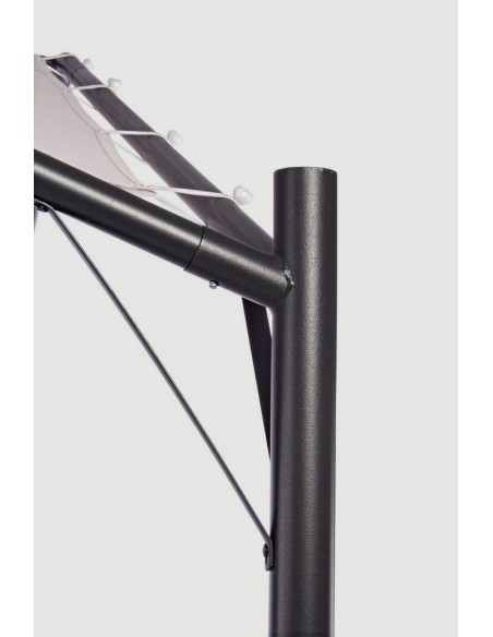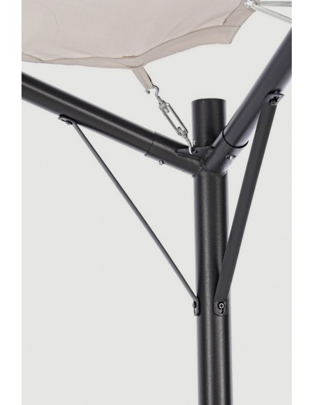 Pavillion med tekstiltag, udført i et design af mørkegrå pulverlakeret stål. Pavillionen måler 260 cm i højden og 350 x 350 cm i bredde og dybde.