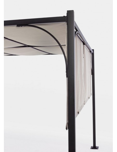Pavillion med skydetag, udført i et design af mørkegrå pulverlakeret stål og beige polyester. Pavillionen måler 225 cm i højden og 400 x 300 cm i bredde og dybde. Taget kan trækkes/skydes fra side til side, således dækning for solens stråler kan fordeles efter behov/ønske.