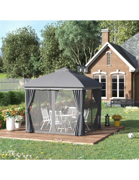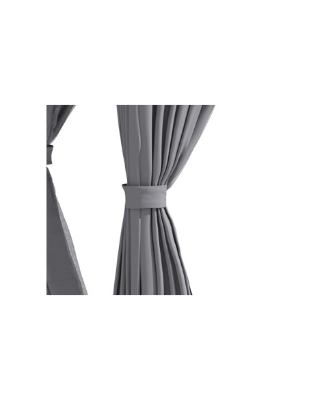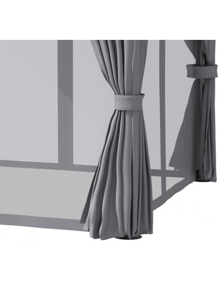Moderne havepavillon udført i et design af aluminium og metal, lakeret i sort. Dertil pavillondække i grå polyester og nylon, med myggenet til alle sider, der kan trækkes til eller fra. Siderne kan lukkes helt af, eller åbnes helt, således du kan sidde både ugeneret eller med udkig. En smuk havepavillon til hygge i haven eller på terrassen. Pavillonen målermåler 2,95 x 2,95 m i bredde og dybde og 2,85 m i højden med indgangshøjde på 2 m.