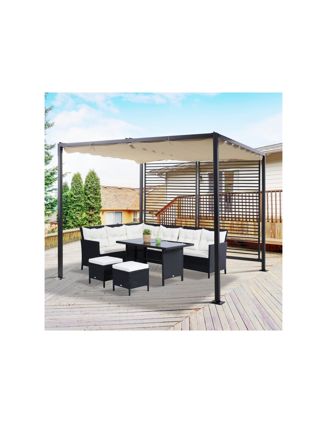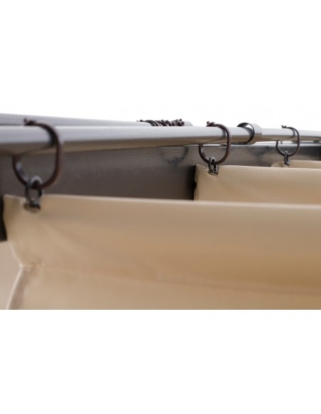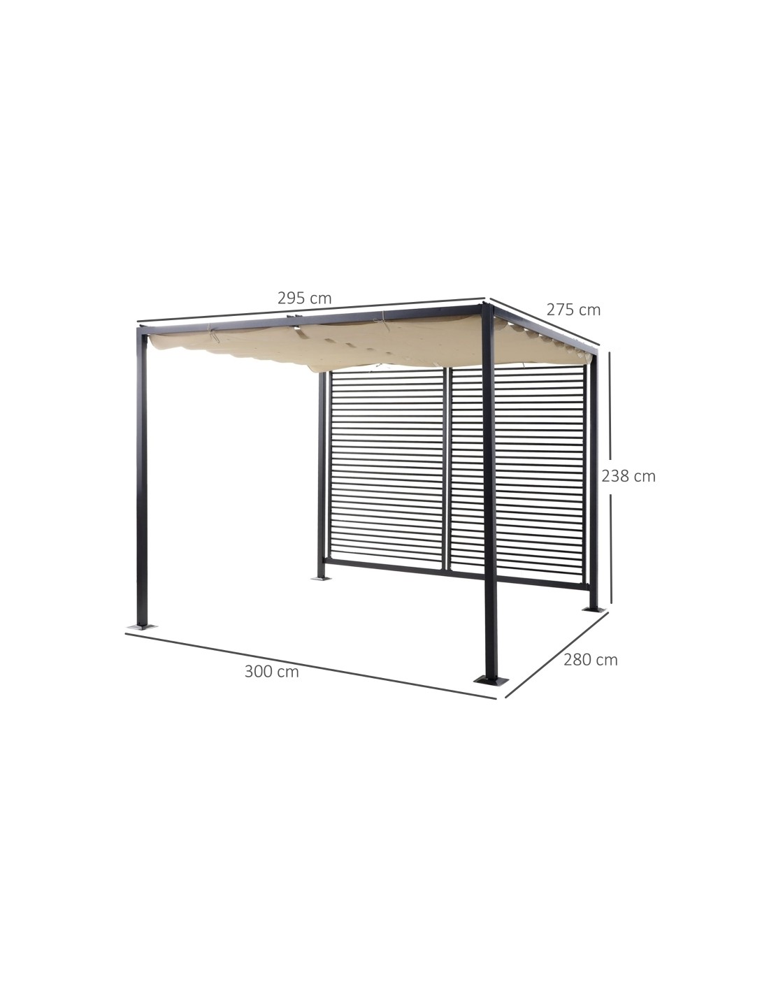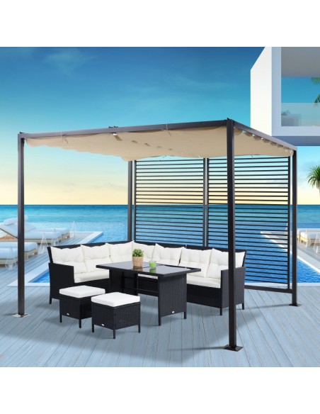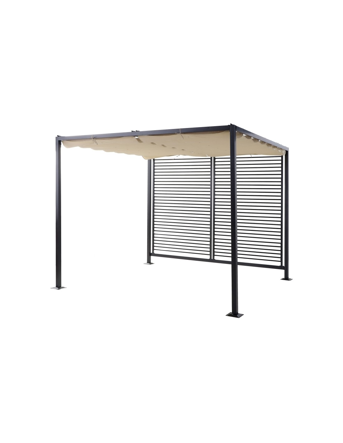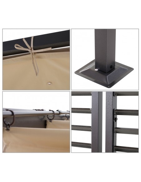 Moderne havepavillon udført i et design af sortlakeret metal og tag i beige polyester der kan skydes til siden. En smuk havepavillon til hygge i haven eller på terrassen. Pavillonen måler 3 x 2,8 m i bredde og dybde og 2,38 m i højden.