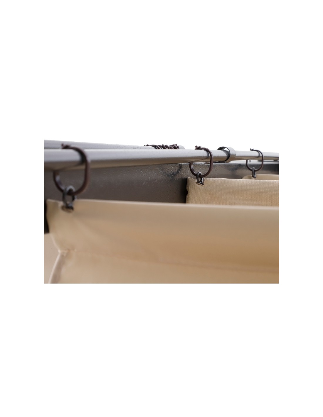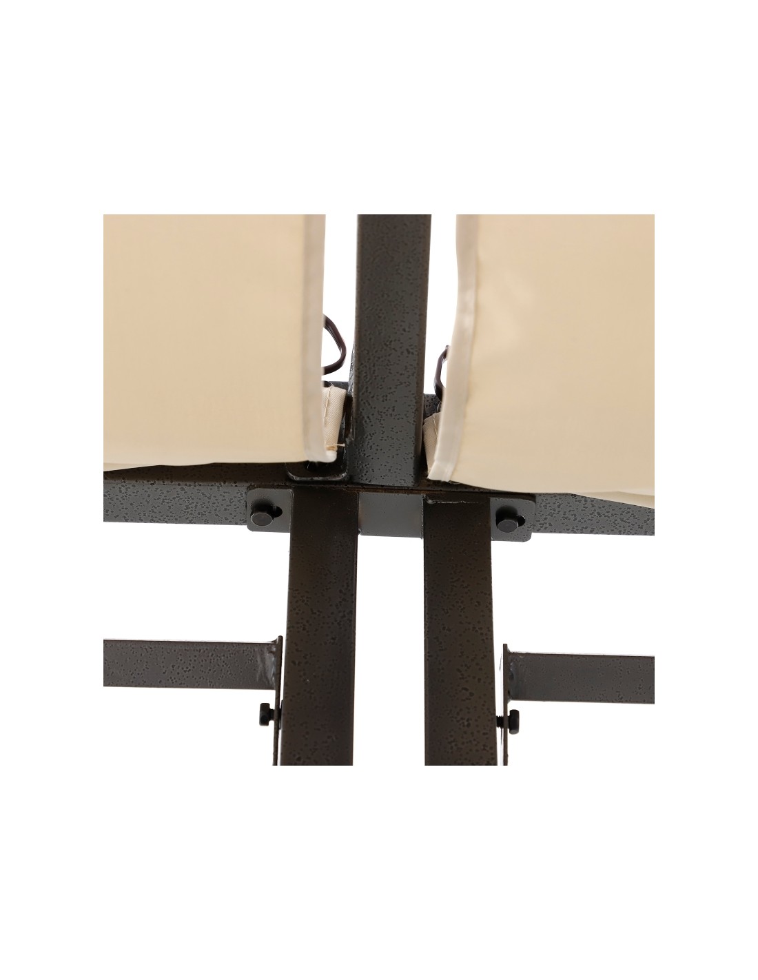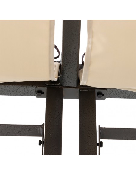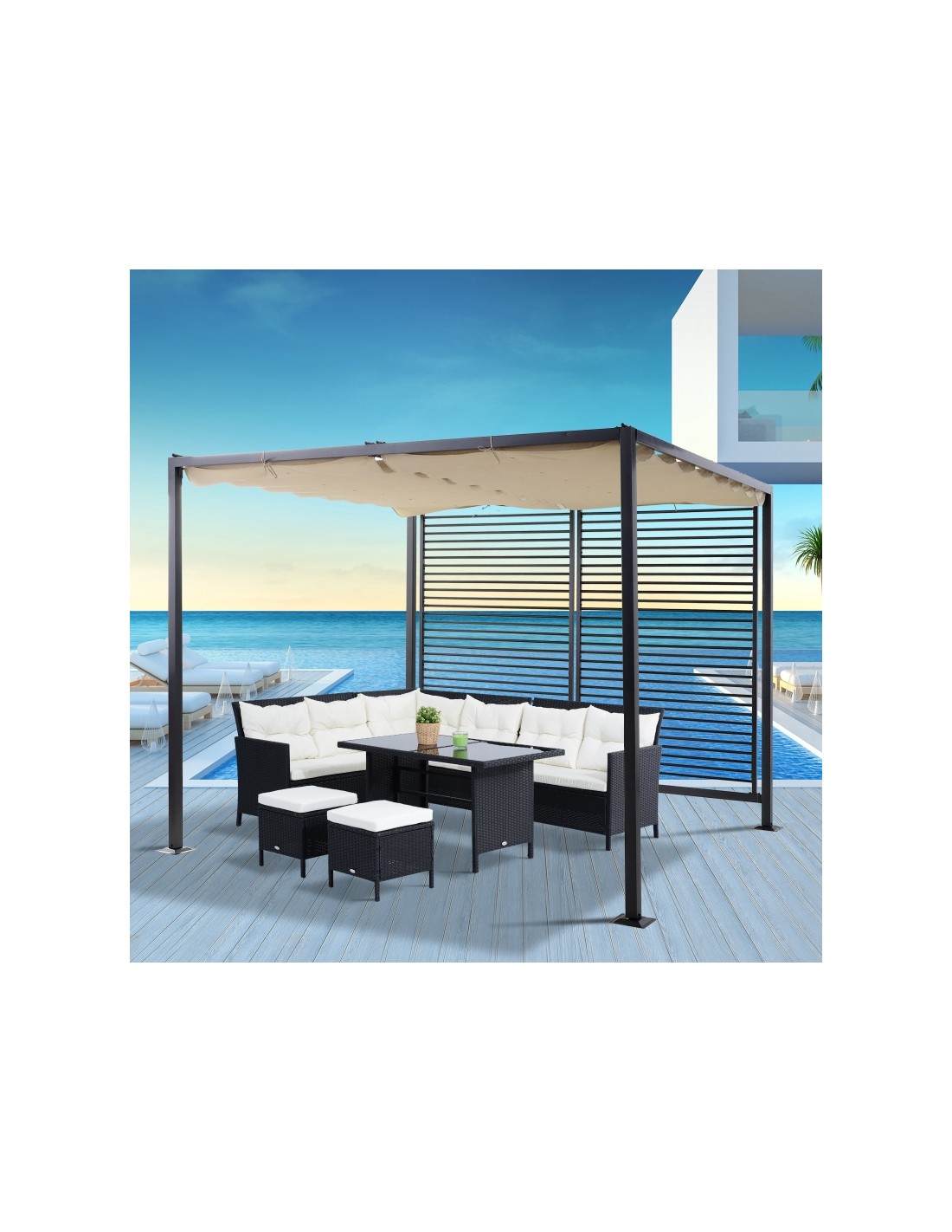 Moderne havepavillon udført i et design af sortlakeret metal og tag i beige polyester der kan skydes til siden. En smuk havepavillon til hygge i haven eller på terrassen. Pavillonen måler 3 x 2,8 m i bredde og dybde og 2,38 m i højden.