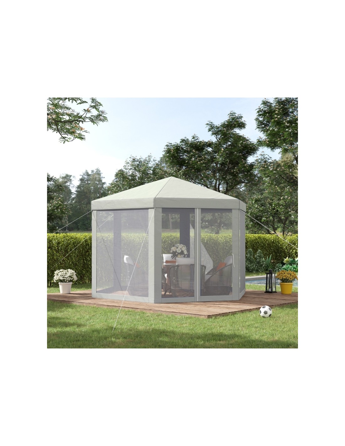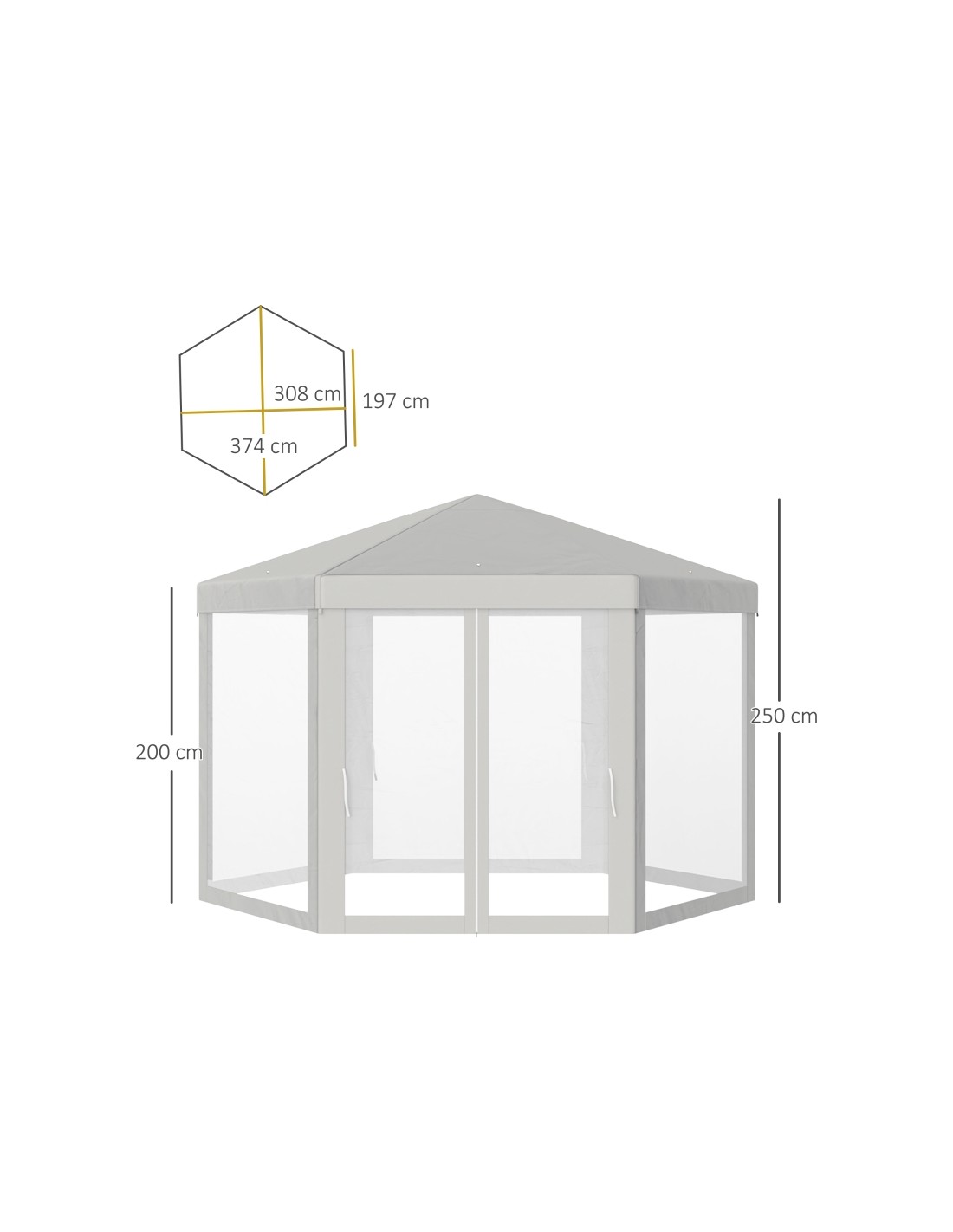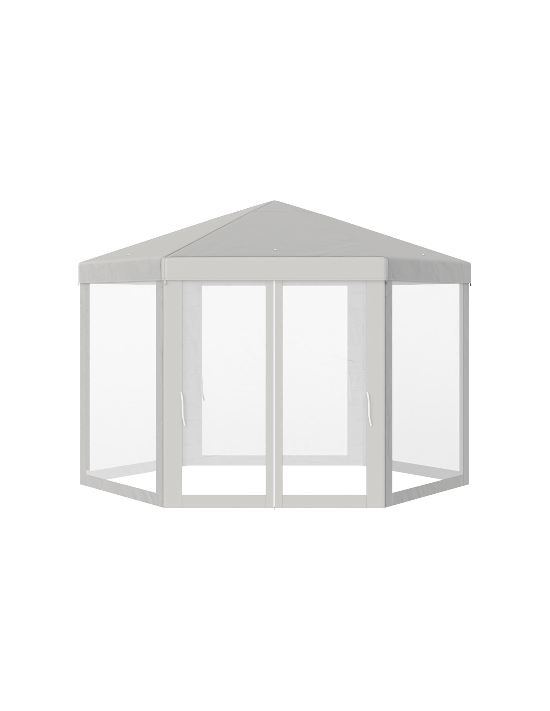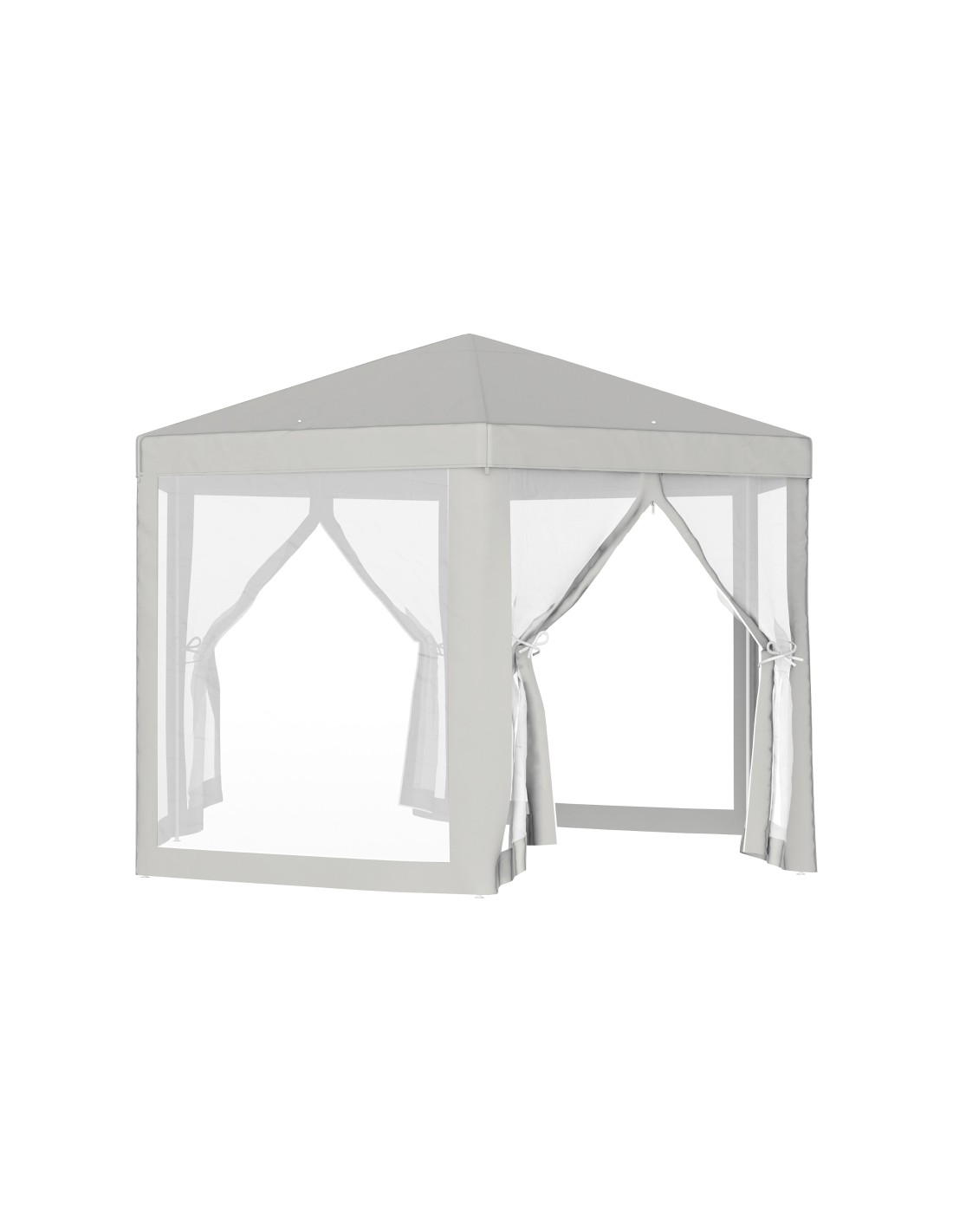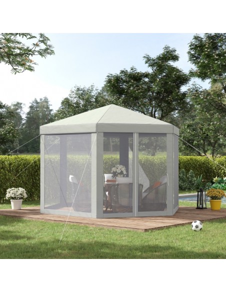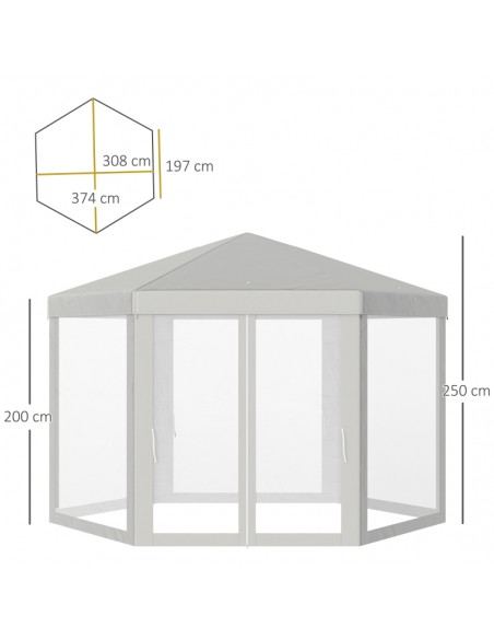 Moderne havepavillon udført i et design af metal og polyester med myggenet til alle sider, hvoraf 2 sider kan trækkes til og fra. En havepavillon til hygge i haven eller på terrassen. Pavillonen måler 1,97 x 2,5 m i bredde og dybde og 2,5 m i højden med indgangshøjde på 2 m.