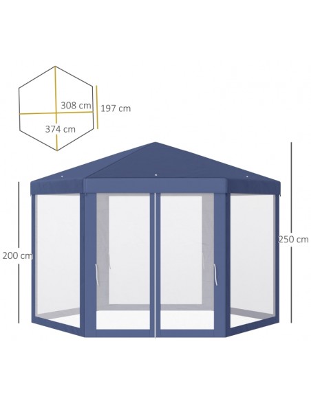 Moderne havepavillon udført i et design af metal og polyester med myggenet til alle sider, hvoraf 2 sider kan trækkes til og fra. En havepavillon til hygge i haven eller på terrassen. Pavillonen måler 1,97 x 2,5 m i bredde og dybde og 2,5 m i højden med indgangshøjde på 2 m.