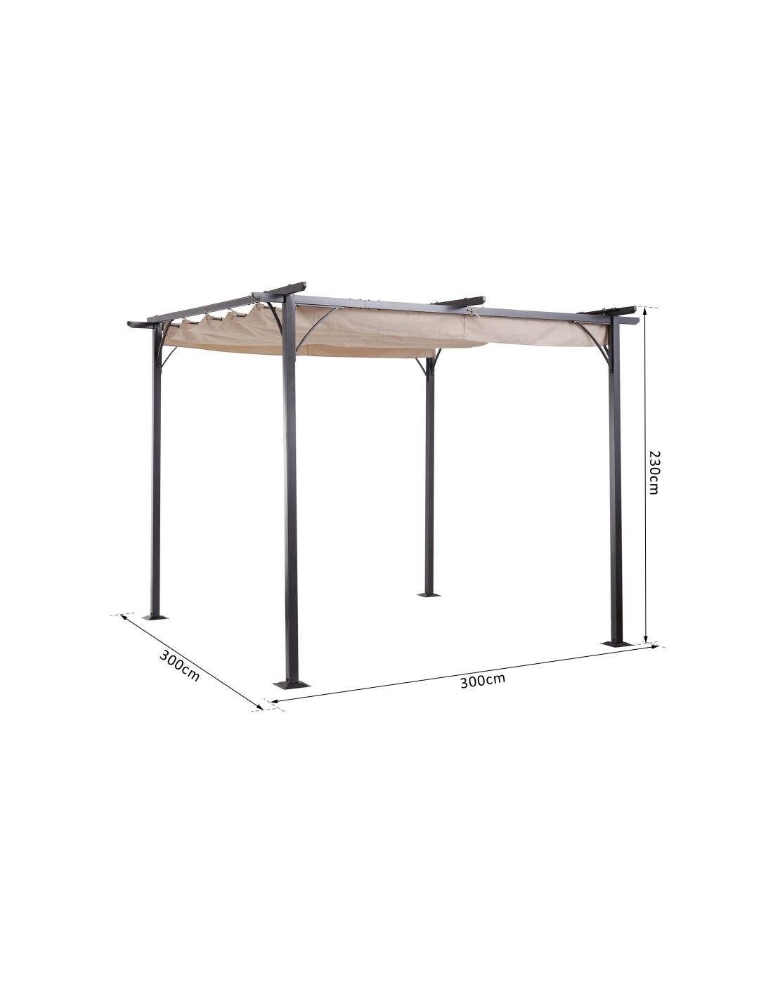 Moderne havepavillon udført i et design af stål og med tag i polyester der kan skydes til siden. En smuk havepavillon til hygge i haven eller på terrassen. Pavillonen måler 3 x 3 m i bredde og dybde og 2,3 m i højden.