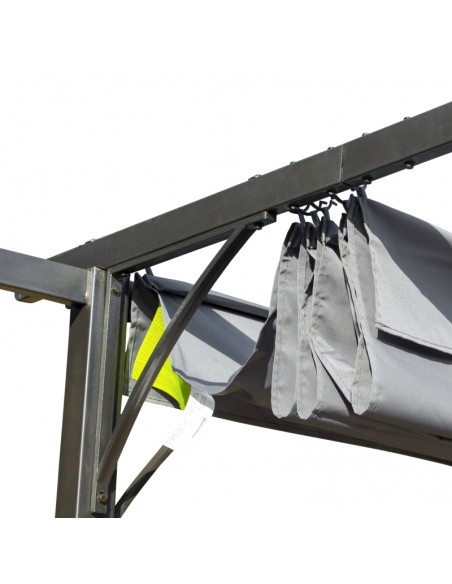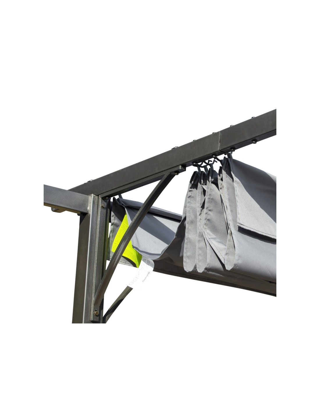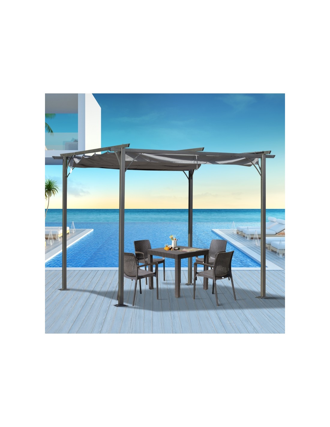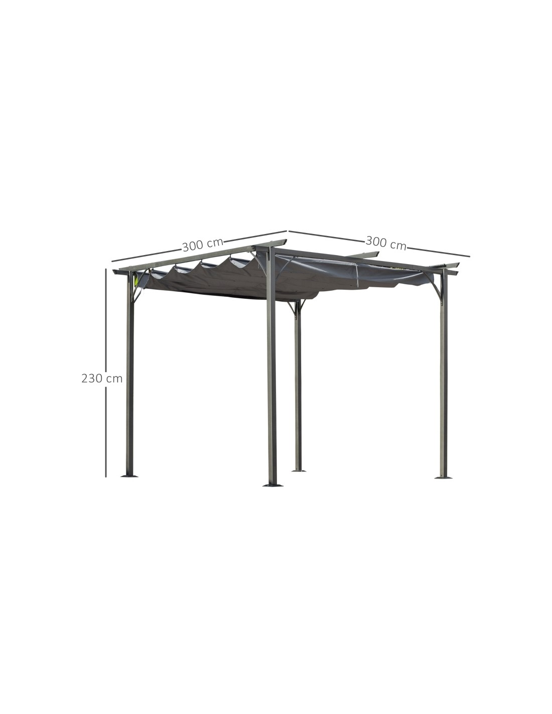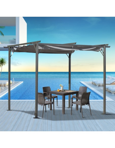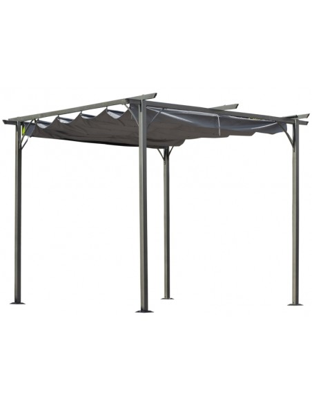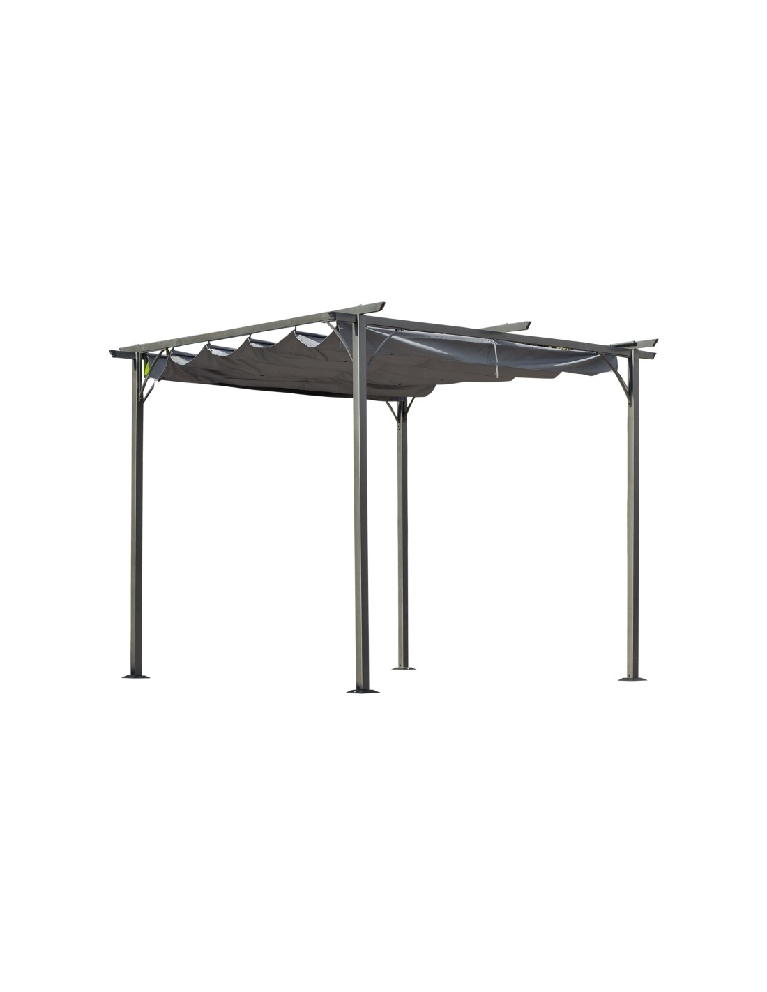 Moderne havepavillon udført i et design af stål og med tag i polyester der kan skydes til siden. En smuk havepavillon til hygge i haven eller på terrassen. Pavillonen måler 3 x 3 m i bredde og dybde og 2,3 m i højden.