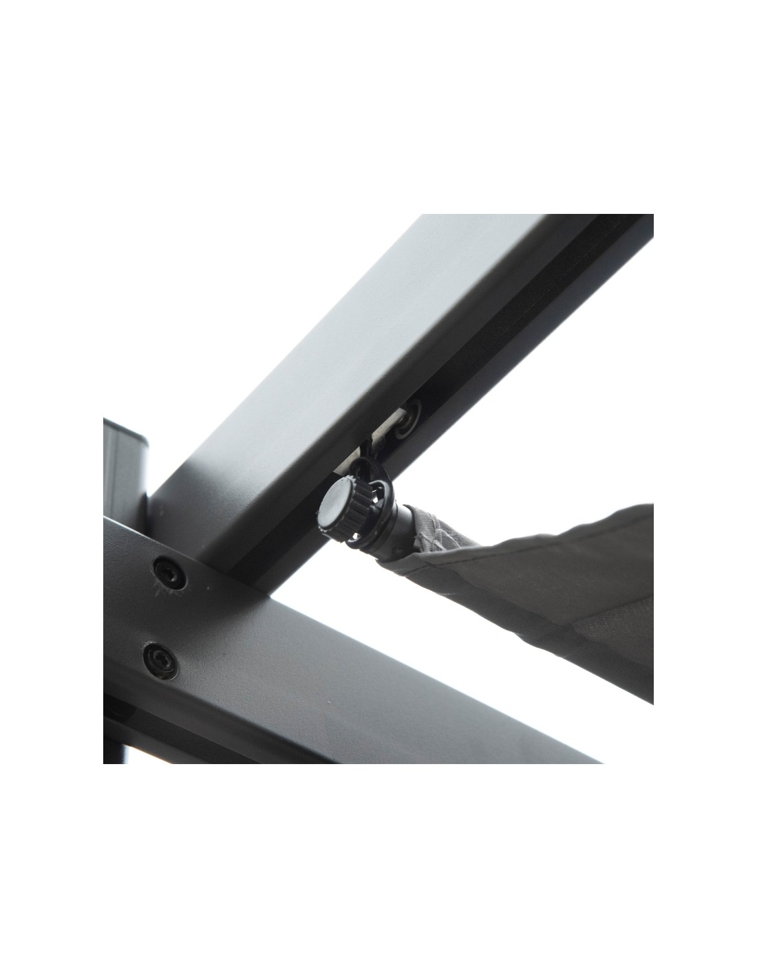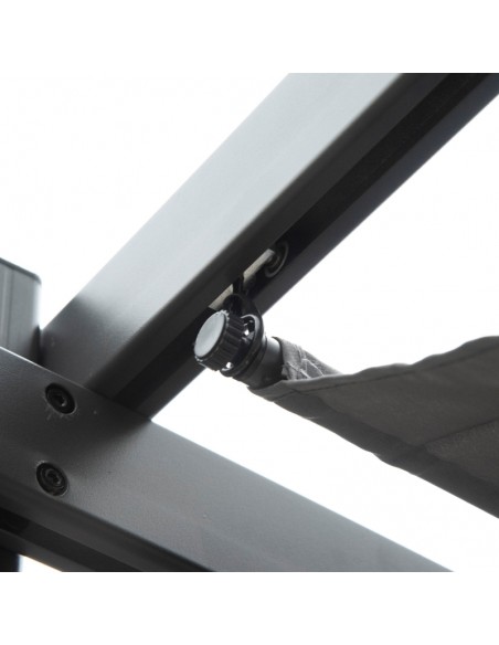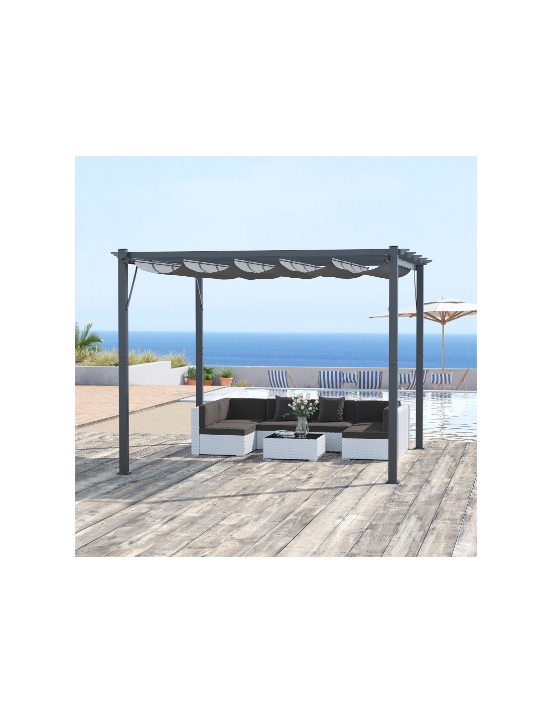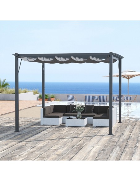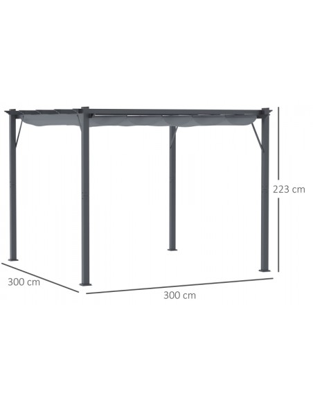 Moderne havepavillon udført i et design af aluminium og med tag i polyester der kan skydes til siden. En smuk havepavillon til hygge i haven eller på terrassen. Pavillonen måler 3 x 3 m i bredde og dybde og 2,23 m i højden.