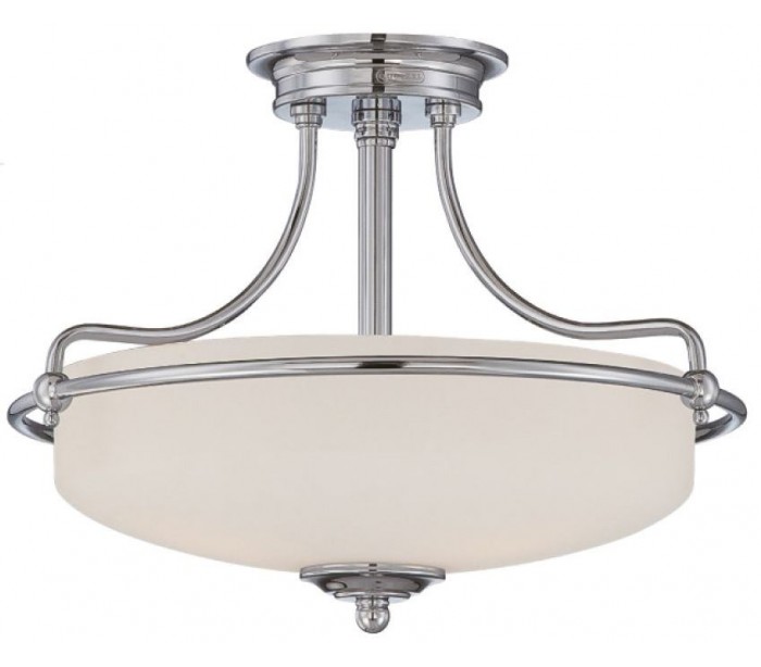Griffin semi-flush plafond i et sandt amerikansk design fra Quoizel. Lampen måler 43,2 cm i diameter og leveres til europæisk standard til 3 x E27 lyskilder. Lampen er udført i poleret kromlakeret stål og med skærm i satineret glas.