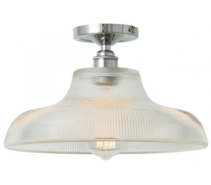 Mono plafond i et industrielt design, fremstillet i poleret kromlakeret messing og med skærm i glas. Lampen måler 30 cm i diameter og anvender 1 x E27 lyskilde.