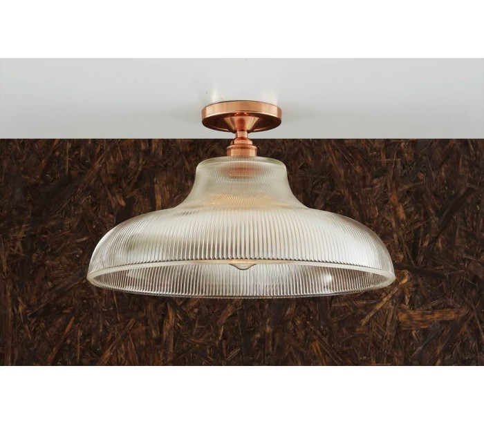 Mono plafond i et industrielt design, fremstillet i poleret kobberlakeret messing og med skærm i glas. Lampen måler 40 cm i diameter og anvender 1 x E27 lyskilde.