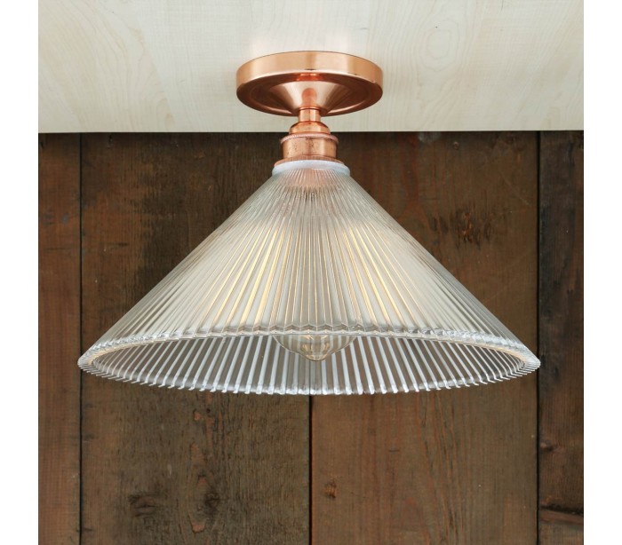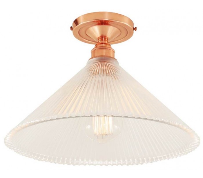 Hanoi plafond i et industrielt design, fremstillet i poleret kobberlakeret messing og med skærm i glas. Lampen måler 30 cm i diameter og anvender 1 x E27 lyskilde.