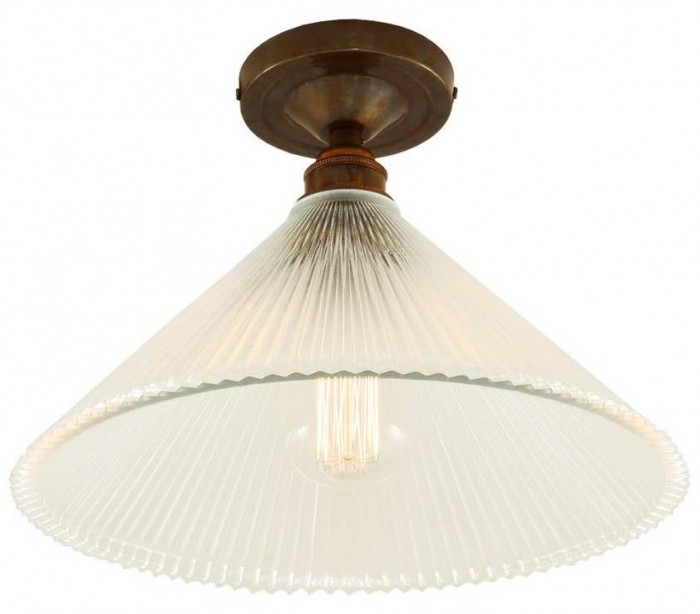 Hanoi plafond i et industrielt design, fremstillet i antik messing og med skærm i glas. Lampen måler 30 cm i diameter og anvender 1 x E27 lyskilde.
