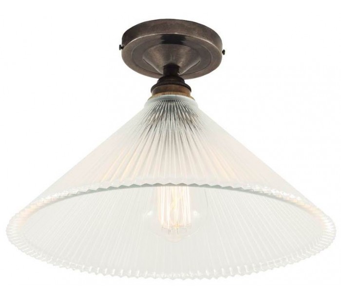 Hanoi plafond i et industrielt design, fremstillet i antik sølvlakeret messing og med skærm i glas. Lampen måler 30 cm i diameter og anvender 1 x E27 lyskilde.