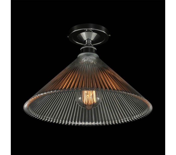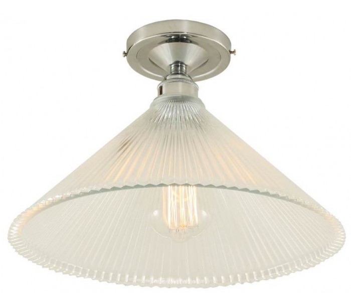 Hanoi plafond i et industrielt design, fremstillet i poleret kromlakeret messing og med skærm i glas. Lampen måler 30 cm i diameter og anvender 1 x E27 lyskilde.