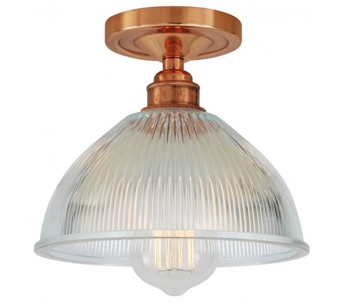 Erbil plafond i et industrielt design, fremstillet i poleret kobberlakeret messing og med skærm i glas. Lampen måler 19,5 cm i diameter og anvender 1 x E27 lyskilde.