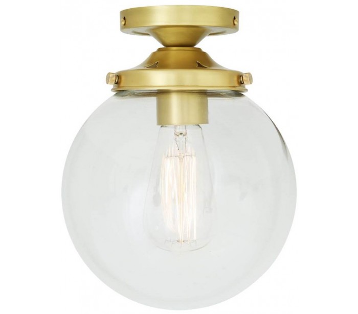 Riad kugleplafond i et moderne design, fremstillet i satineret messing og med skærm i glas. Lampen måler 20 cm i diameter og anvender 1 x E27 lyskilde.