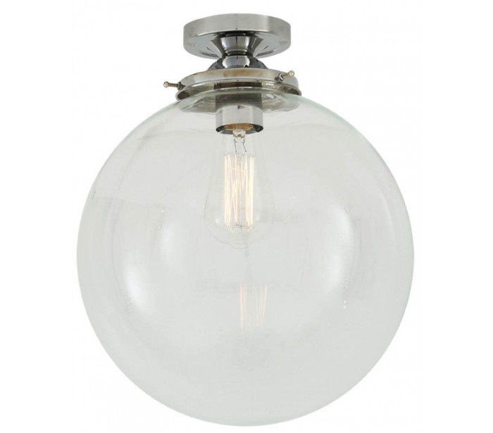 Riad kugleplafond i et moderne design, fremstillet i poleret kromlakeret messing og med skærm i glas. Lampen måler 30 cm i diameter og anvender 1 x E27 lyskilde.