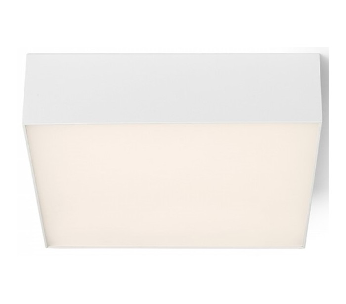 Plafond udført i et moderne stilrent design af hvidlakeret metal, og med skærm i hvid polycarbonat. Plafonden måler 22 x 22 cm i bredde og dybde og er udstyret med LED lyskilde på 20W.