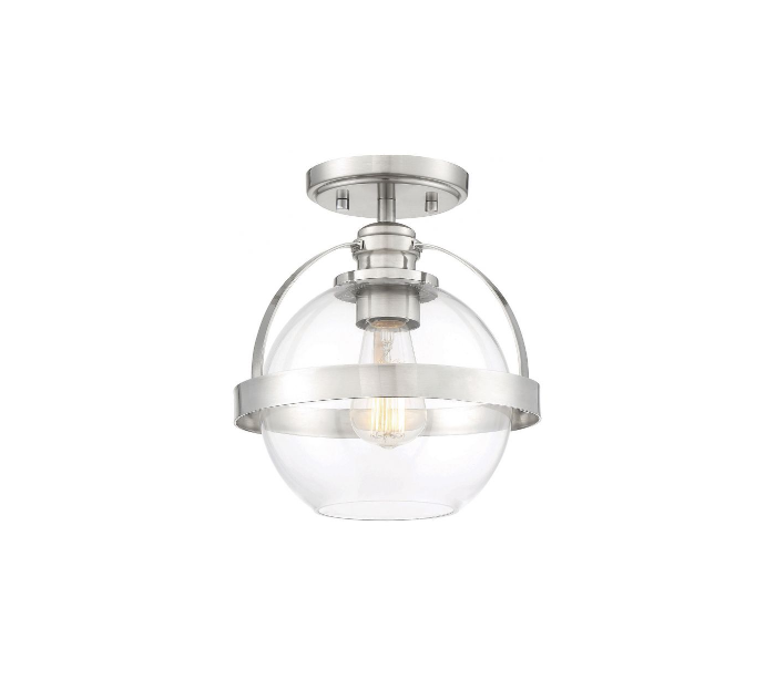 Pendleton 1 plafond udført i et design af satineret nikkel lakeret stål og klart glas. Lampen er fra amerikanske Savoy House og anvender 1 x E27 lyskilde og måler 24 cm i diameter og 25 cm i højden.