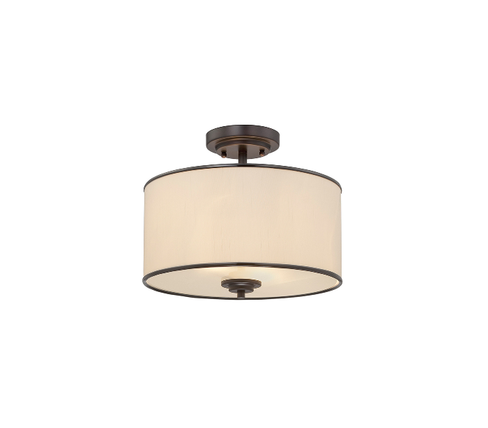 Grove 2 plafond udført i et design af antik bronzelakeret stål og cremefarvet tekstil. Lampen er fra amerikanske Savoy House og anvender 2 x E27 lyskilder og måler 36 cm i diameter og 30 cm i højden.