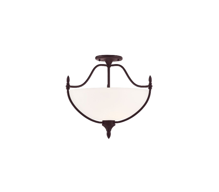 Herndon 3 plafond udført i et design af antik bronzelakeret stål og hvid opalglas. Lampen er fra amerikanske Savoy House og anvender 3 x E27 lyskilder og måler 46 cm i diameter og 39 cm i højden.