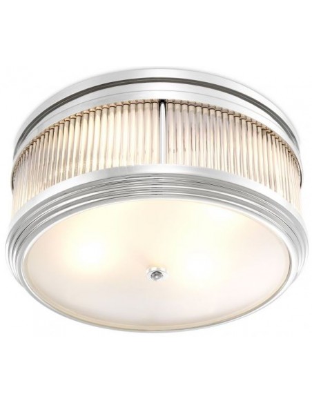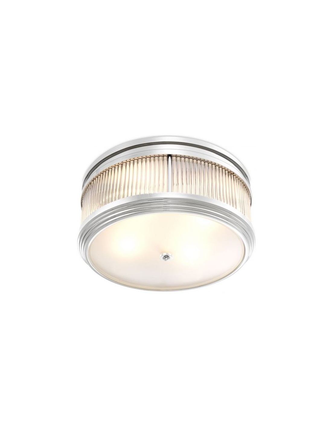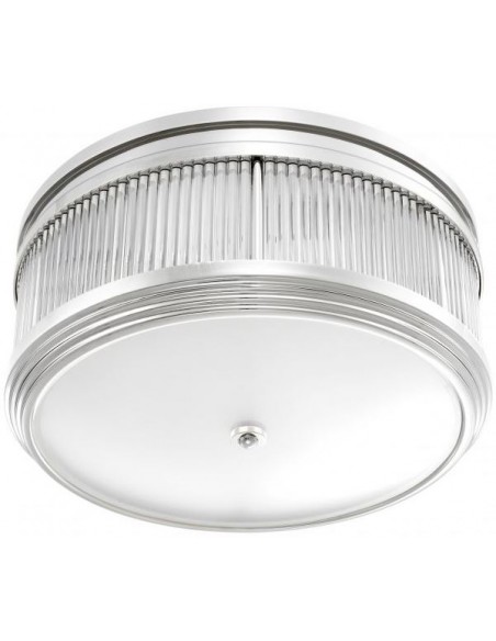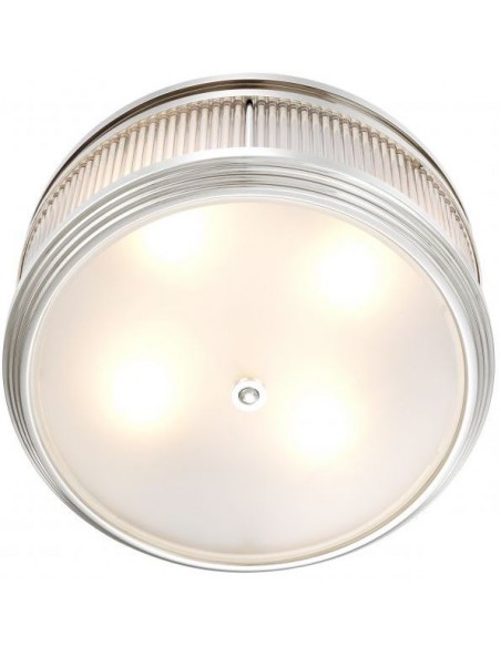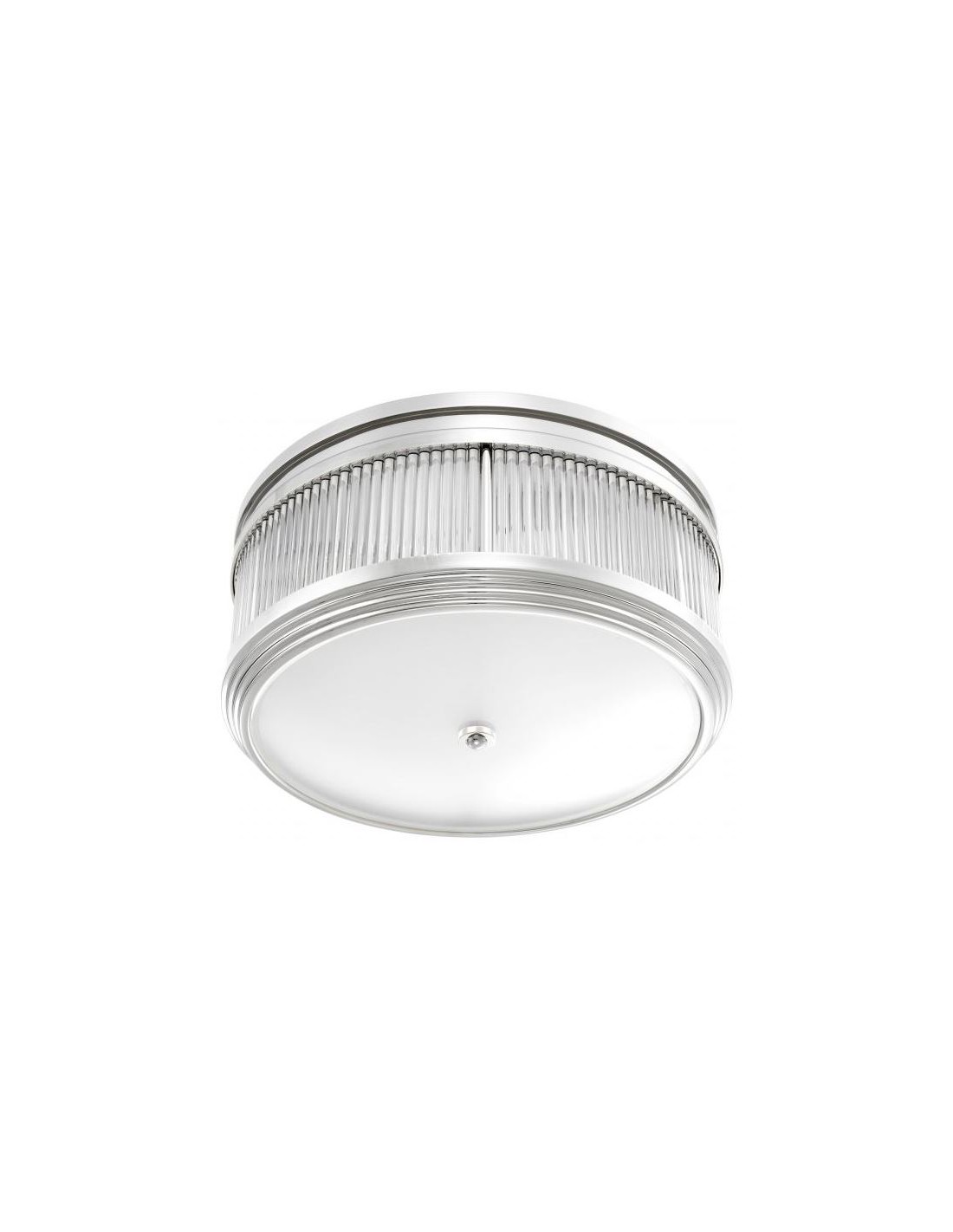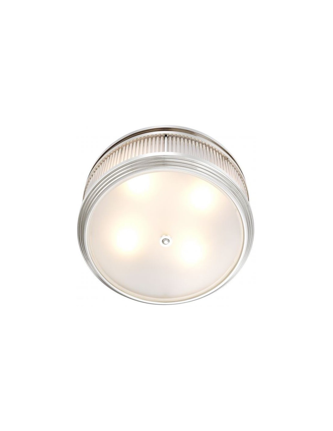 Eichholtz Rousseau plafond udført i et design af nikkel lakeret aluminium og med skærm i rillet og frostet glas. Væglampen måler 18,5 cm i højde/fremspring og 40,5 cm i diameter. Lampen anvender 4 x E27 lyskilder.