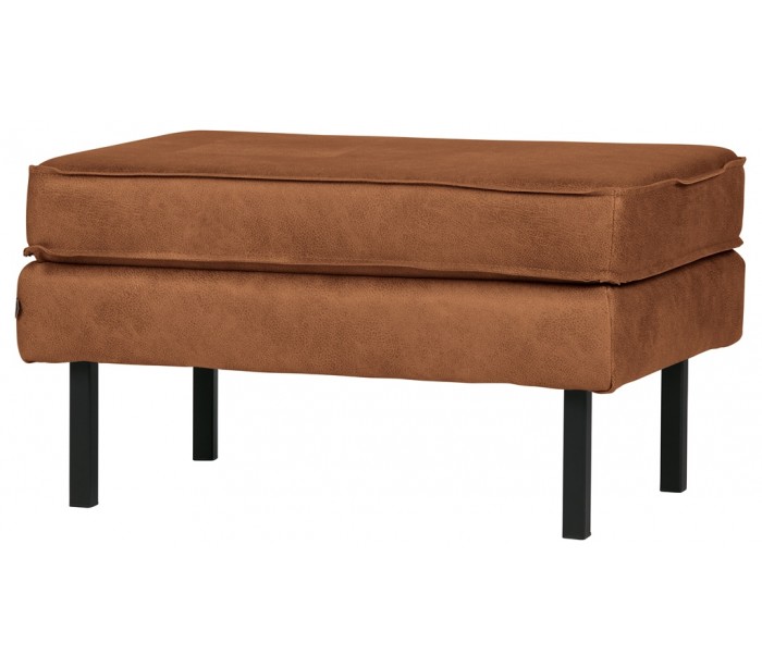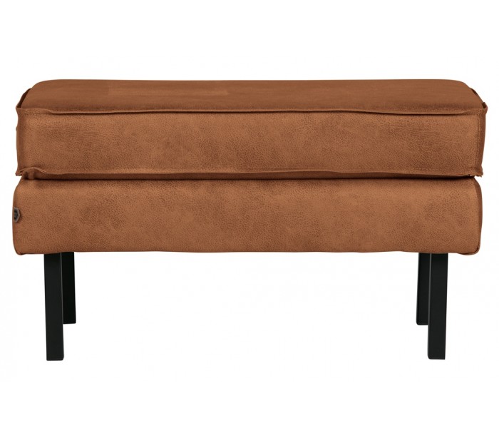 Moderne skammel i et design fremstillet i vintage cognac farvet læder og med ben i sortlakeret metal. Skamlen måler 84 x 54 cm i bredde og dybde, og 45 cm i højden. Skamlen er polstret med højkvalitets skum.