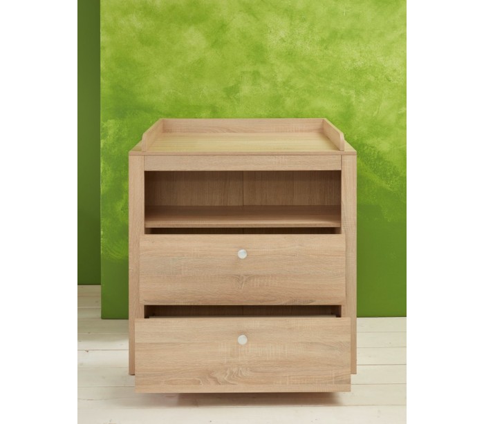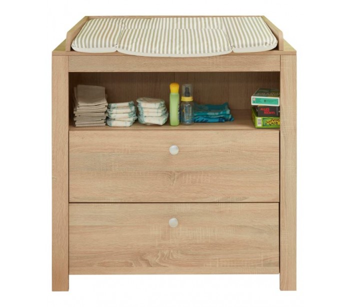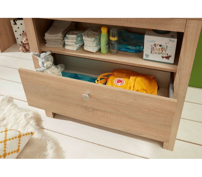 Olivia puslebord til børneværelset, udført i et design af sonoma egetræsfarvet møbelplade. Kommoden måler 102 cm i højden og 96 x 69 cm i bredde og dybde. Kommoden indeholder 2 skuffer og 1 åbent hylderum. Top kan fjernes for anvendelse som almindelig kommode.