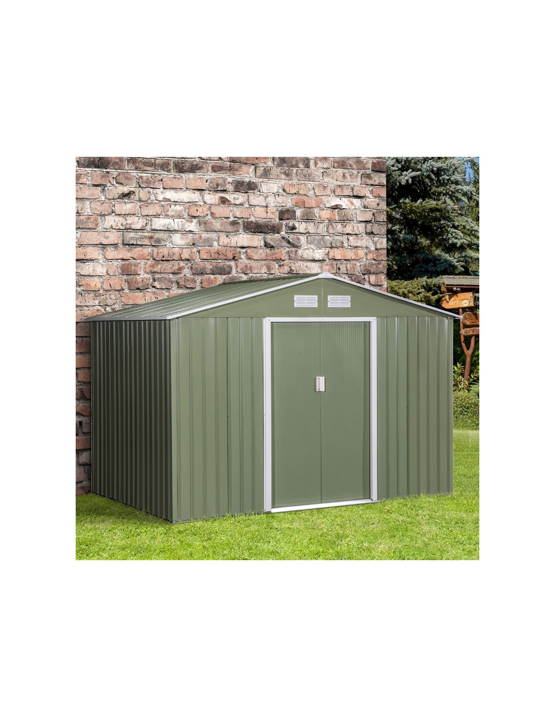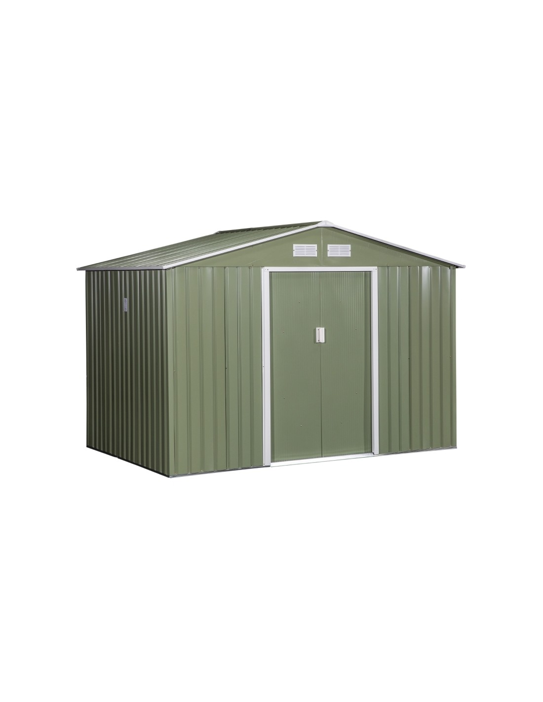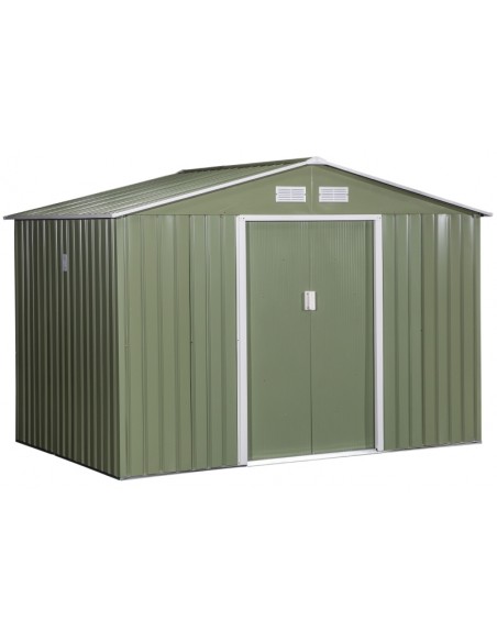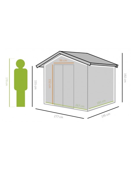 Redskabsskur udført i et design af forzinket stål. Redskabsskuret måler 192 cm i højden og 277 x 195 cm i bredde og dybde. Skuret er med skydedøre.