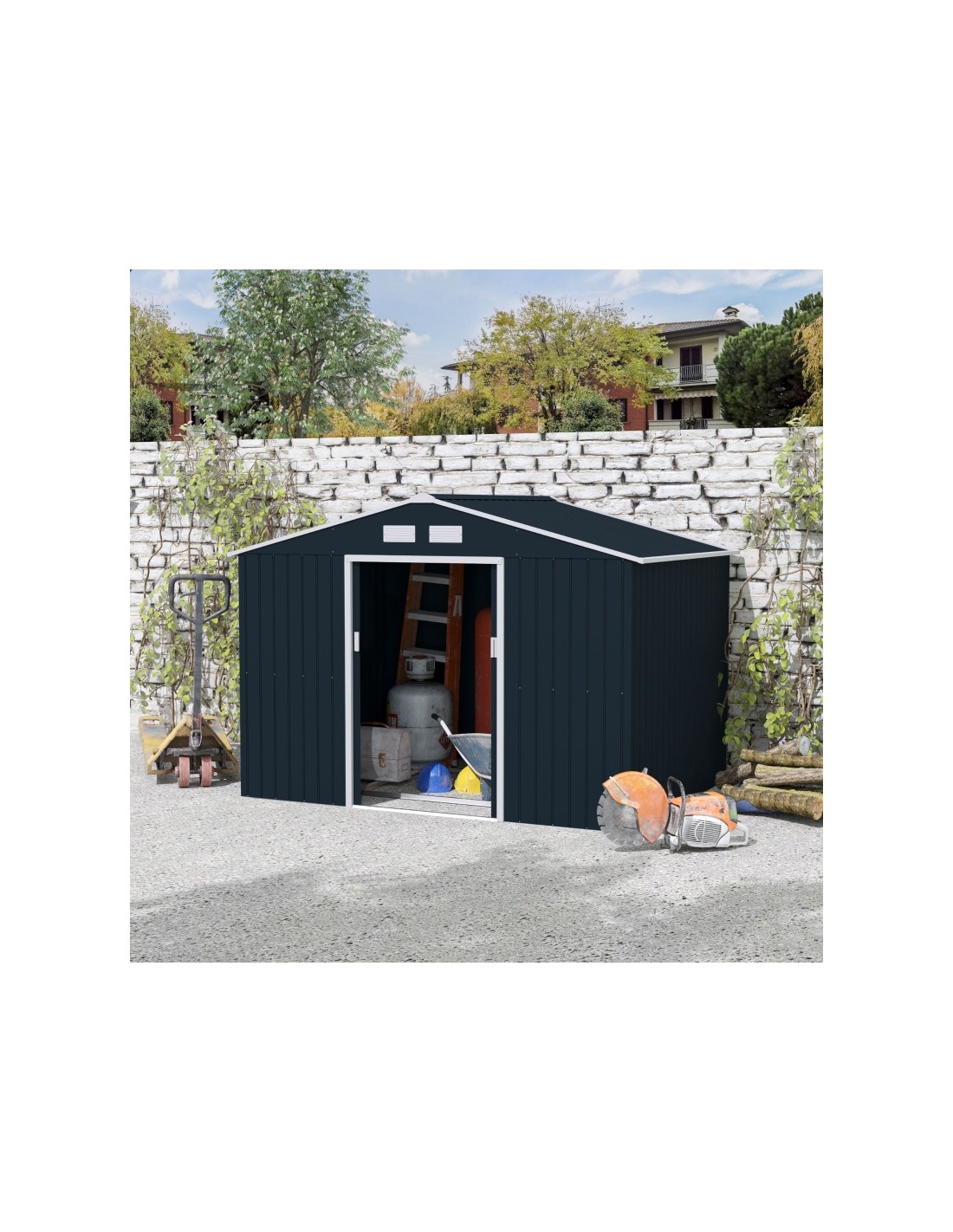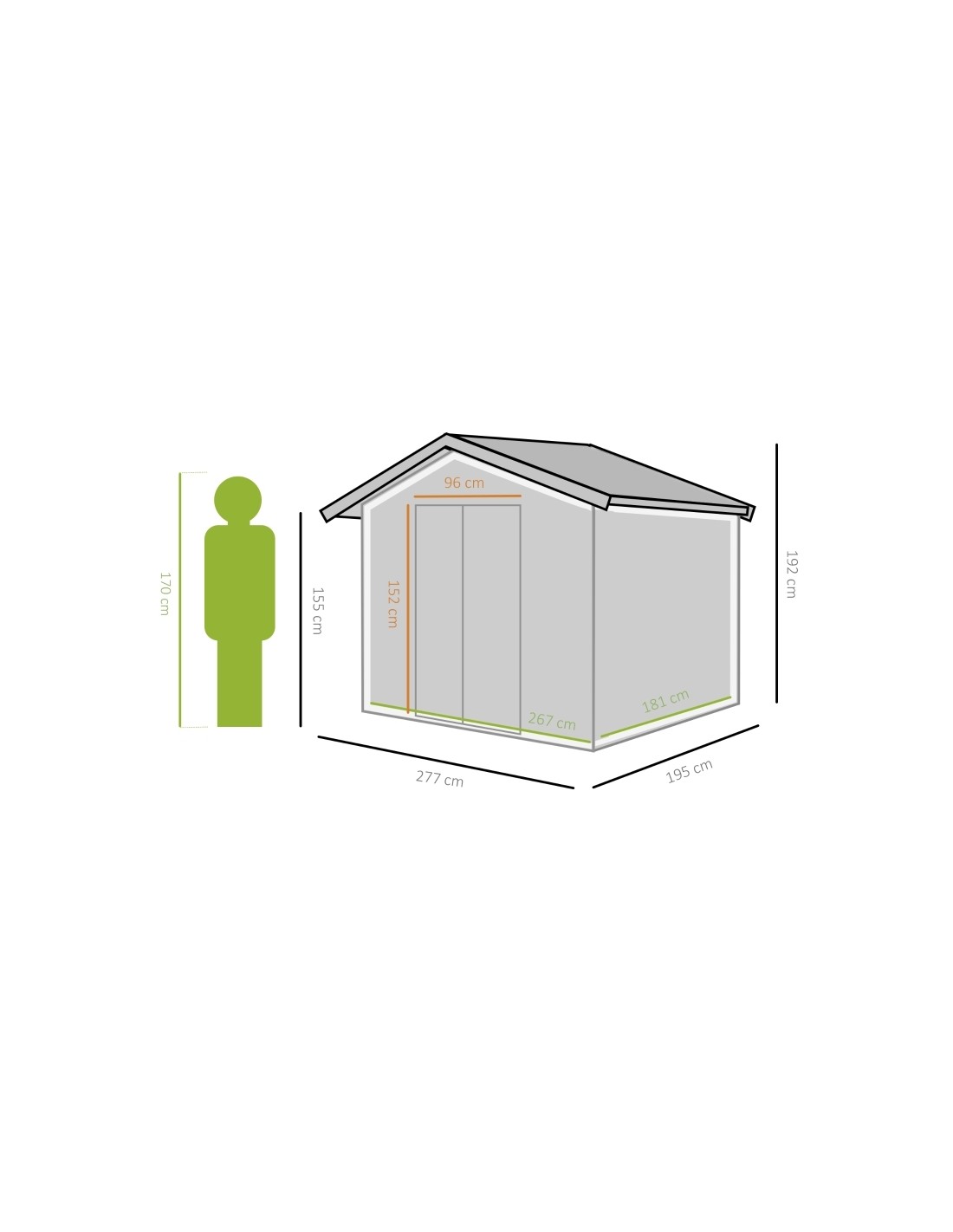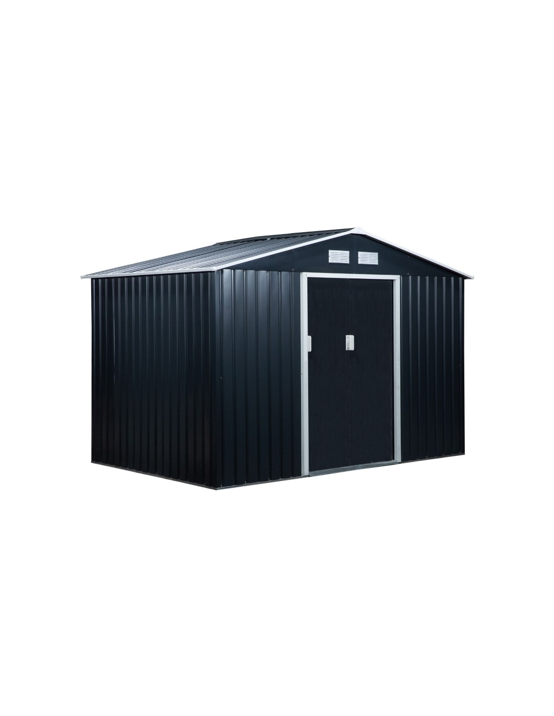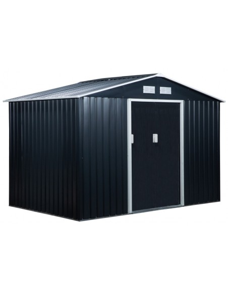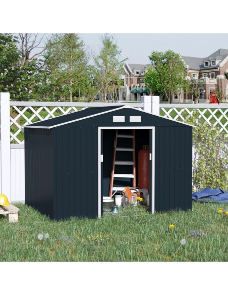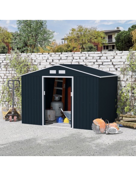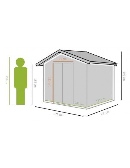 Redskabsskur udført i et design af forzinket stål. Redskabsskuret måler 192 cm i højden og 277 x 195 cm i bredde og dybde. Skuret er med skydedøre.