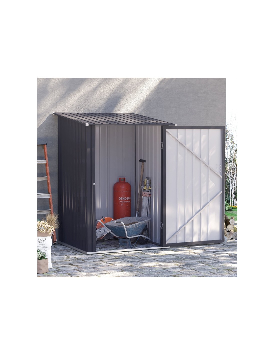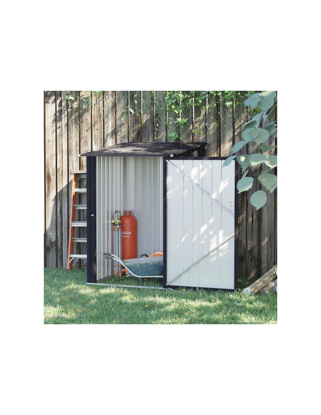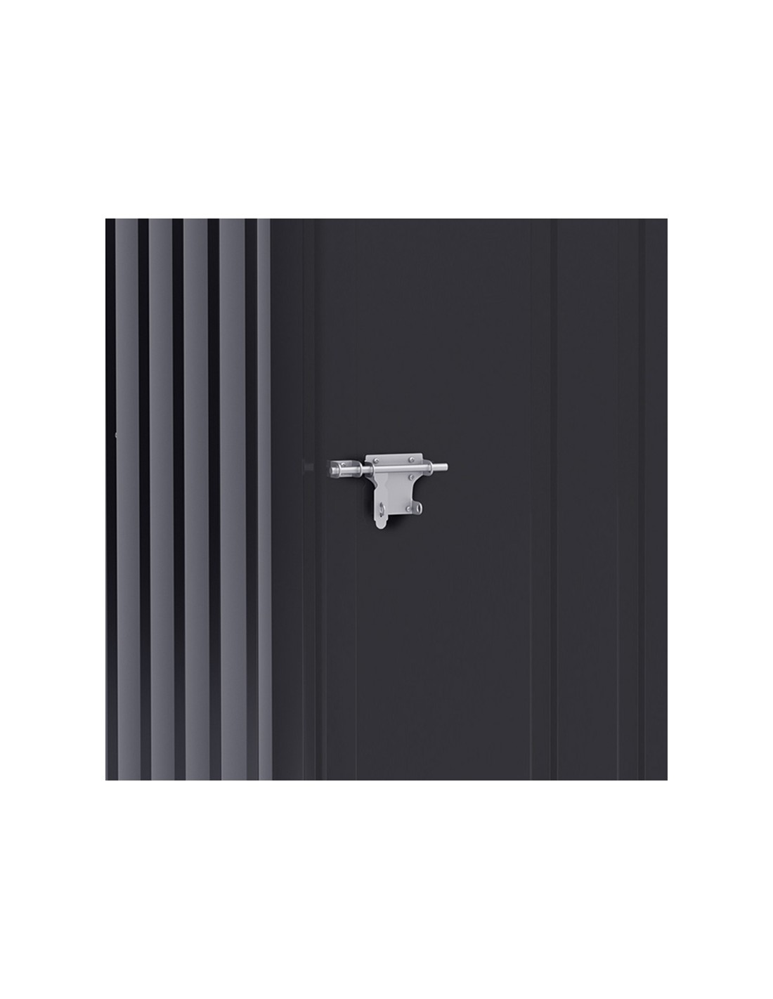 Redskabsskur udført i et design af forzinket stål. Redskabsskuret måler 146 - 160 cm i højden og 100 x 101 cm i bredde og dybde.