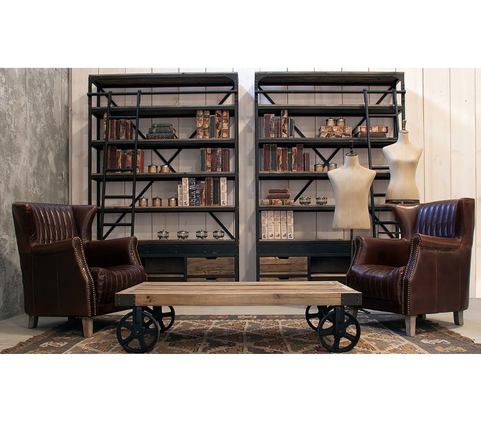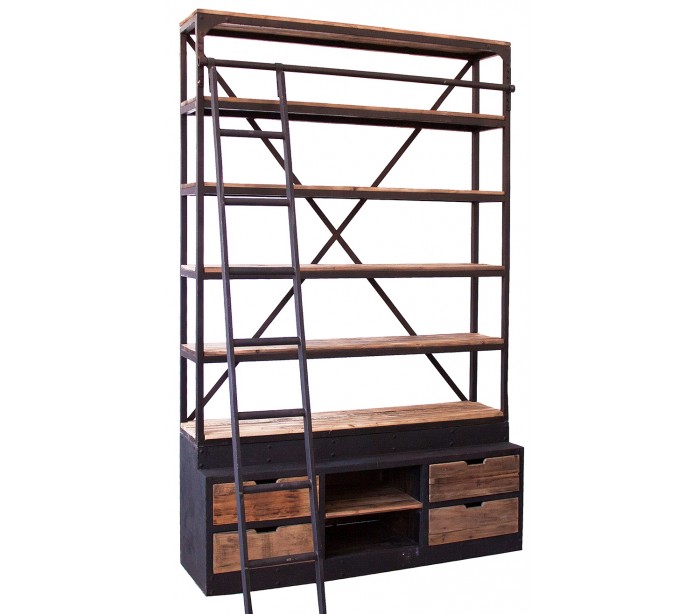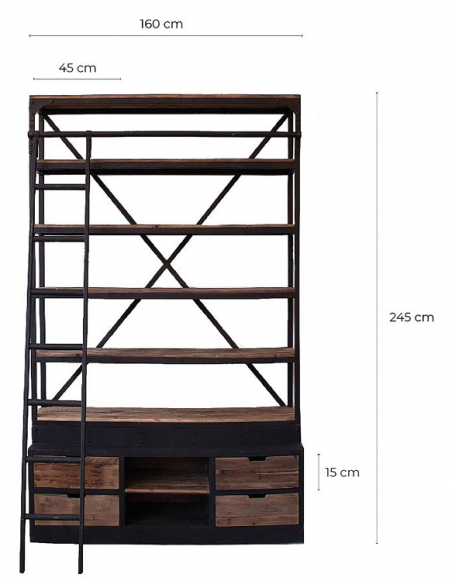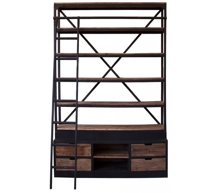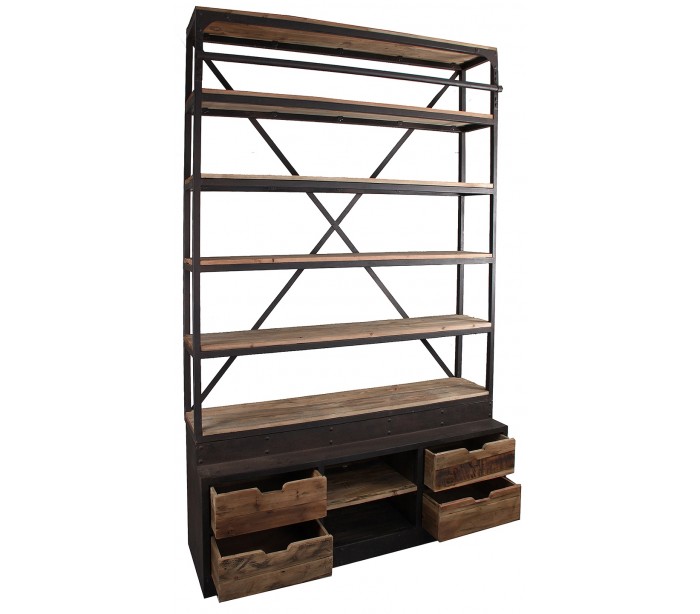 Reol i et industrielt design, fremstillet af genanvendt fyrretræ og antik sortlakeret jern. Reolen måler 245 cm i højden og 160 cm i bredden og indeholder 7 hylderum og 4 skuffer. Bemærk venligst, at der jf. det industrielle design, kan være små ujævnheder.