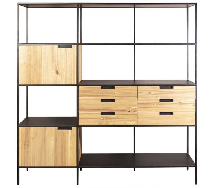 Reolsystem i et moderne design, fremstillet i sortlakeret metal og naturfarvet akacietræ. Reolen måler 190 cm i højden og 180 x 42 cm i bredde og dybde og indeholder 8 hylderum, 2 skabe og 6 skuffer.