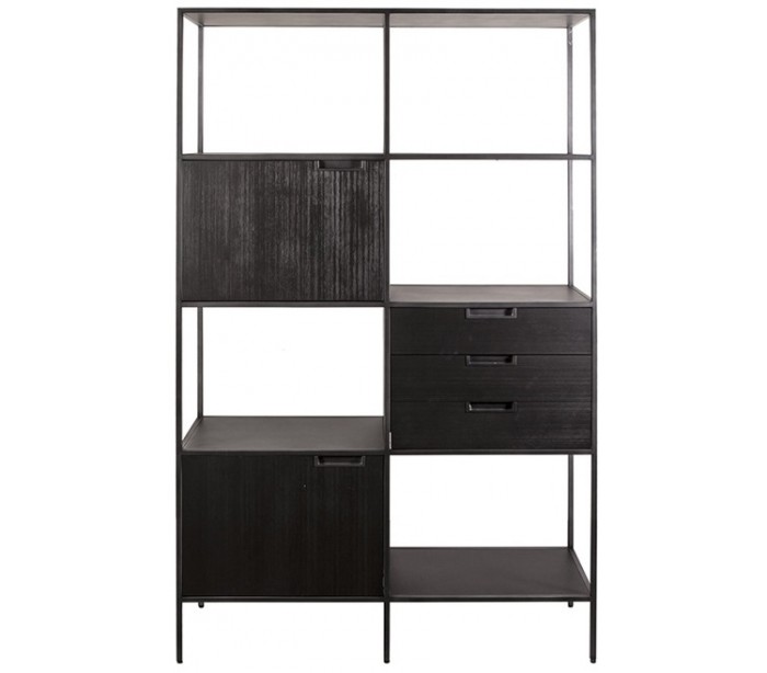 Reolsystem i et moderne design, fremstillet i sortlakeret metal og sortlakeret akacietræ. Reolen måler 190 cm i højden og 116 x 42 cm i bredde og dybde og indeholder 5 hylderum, 2 skabe og 3 skuffer.