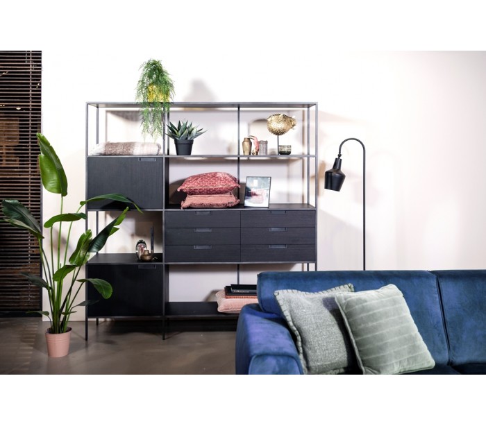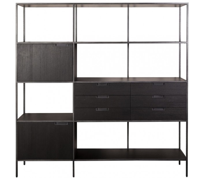 Reolsystem i et moderne design, fremstillet i sortlakeret metal og sortlakeret akacietræ. Reolen måler 190 cm i højden og 180 x 42 cm i bredde og dybde og indeholder 8 hylderum, 2 skabe og 6 skuffer.