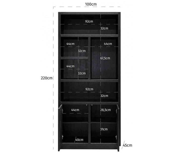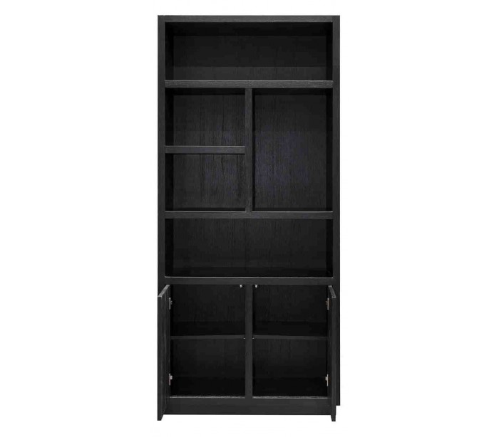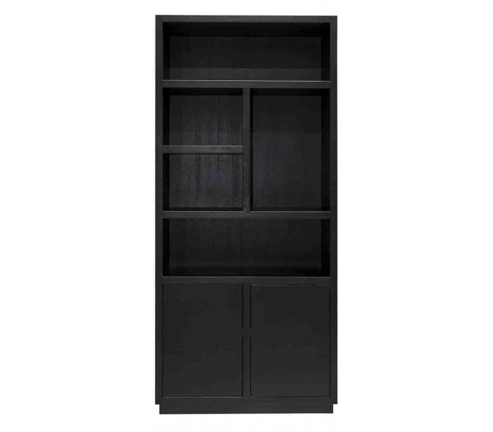 Bogreol udført i et stilrent design, fra hollandske Richmond Interiors. Reolen er fremstillet i sort egetræsfinér og kommer med 5 hylderum samt 2 skabe, hver med 2 hylderum bag. Reolen måler 220 cm i højden og 100 x 45 cm i bredde og dybde.