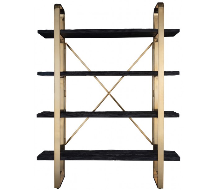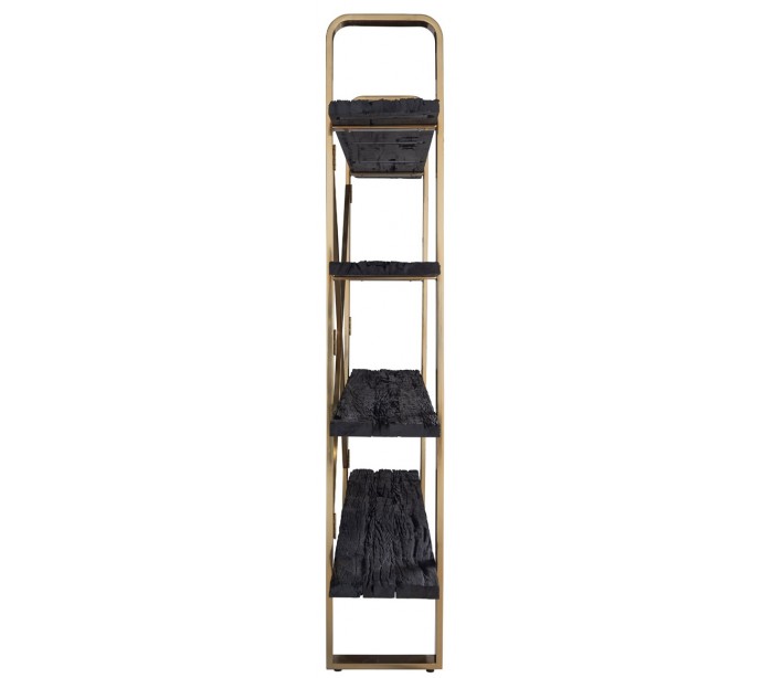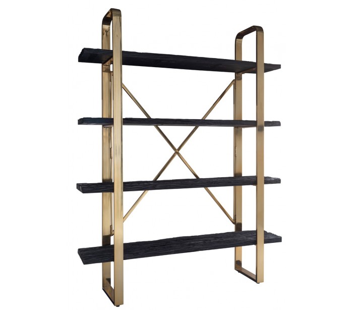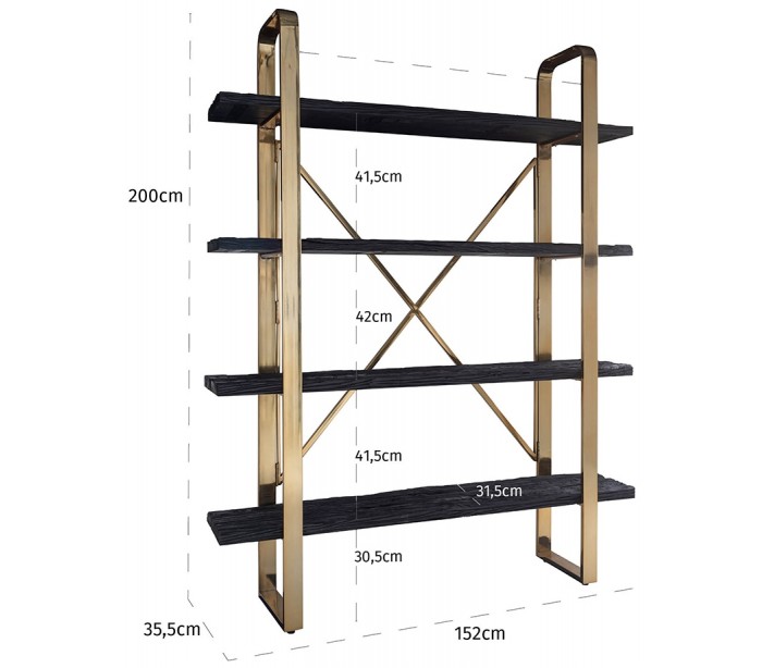 Reol udført i et design fra hollandske Richmond Interiors. Reolen er fremstillet i guldfarvet stål og sortlakeret genanvendt træ (meget rustikke overflader) og kommer med 4 hylder. Reolen måler 200 cm i højden og 152 x 35,5 cm i bredde og dybde.