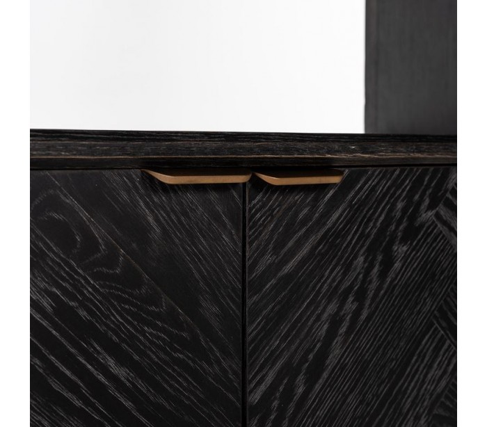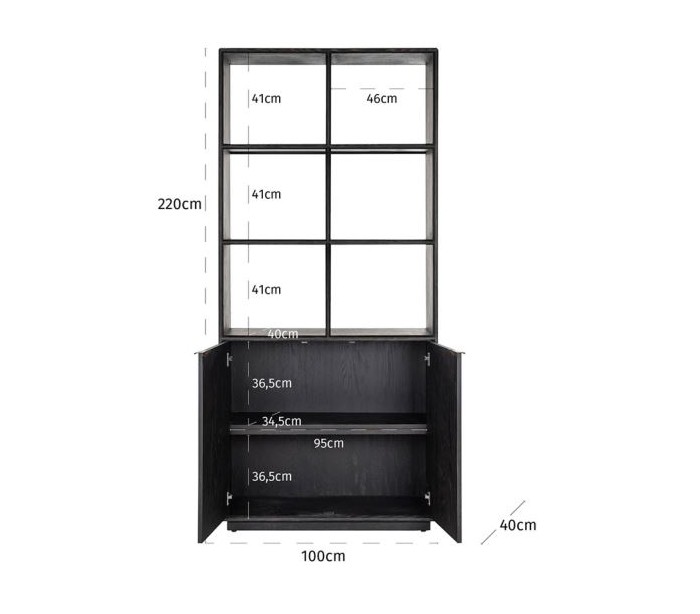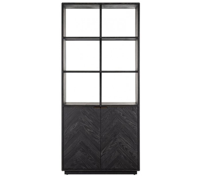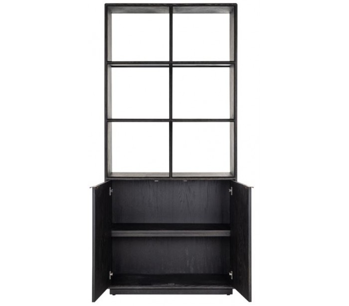 Reol udført i et stilrent design, fra hollandske Richmond Interiors. Reolen er fremstillet i børstet sortlakeret egetræ og kommer med 6 hylderum samt 2 skabe, med i alt 2 hylderum bag. Reolen måler 220 cm i højden og 100 x 40 cm i bredde og dybde.