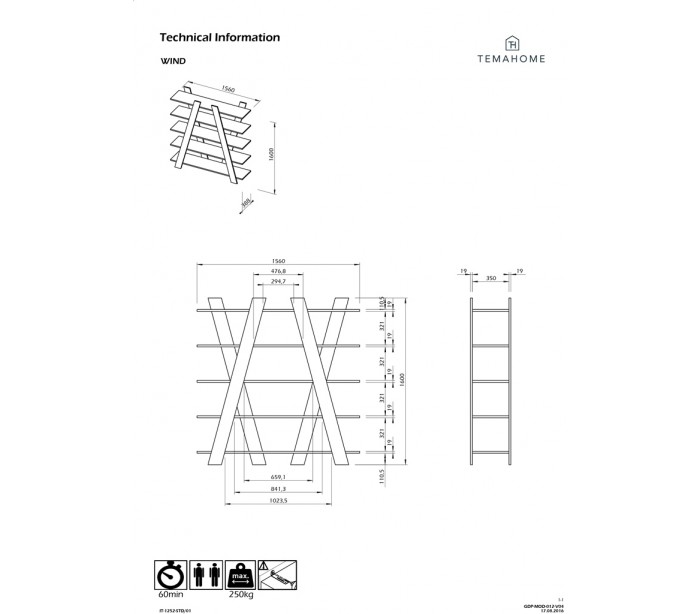 TemaHome Wind reol/rumdeler, udført i et design af egetræsfarvet finér. Reolen måler 160 cm i højden og 156 x 39 cm i bredde og dybde.