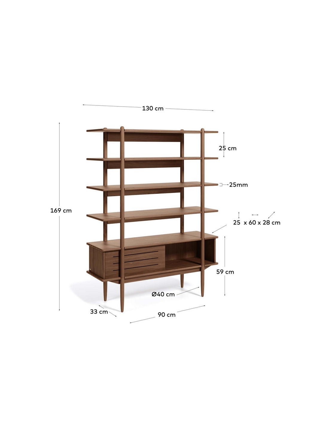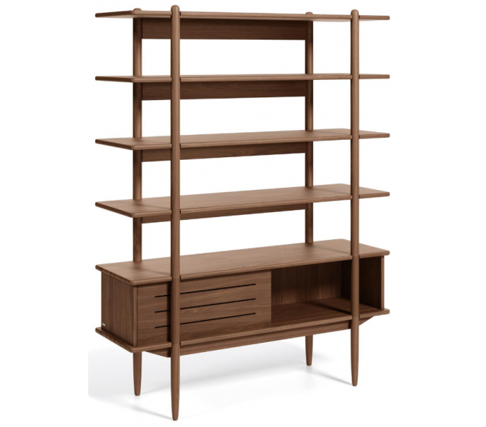 Reol med 1 skabskabinet med skydelåge samt 4 hylderum, udført i et skandinavisk design fra LaForma. Reolen er fremstillet i valnøddetræ og finér og måler 169 cm i højden.