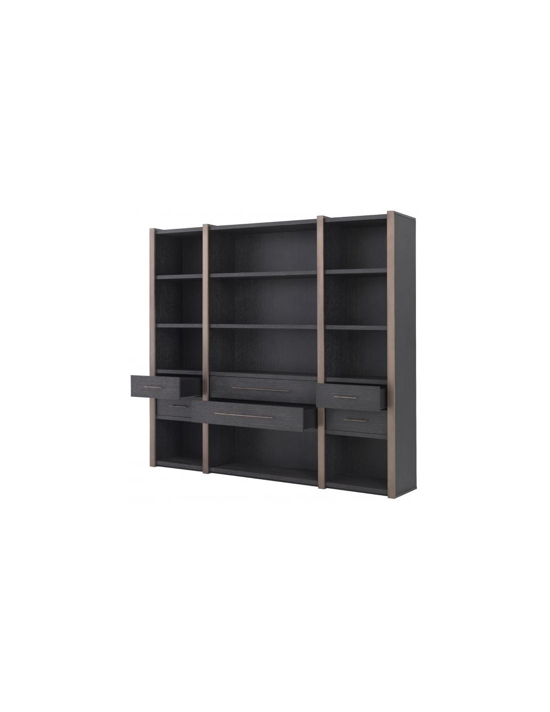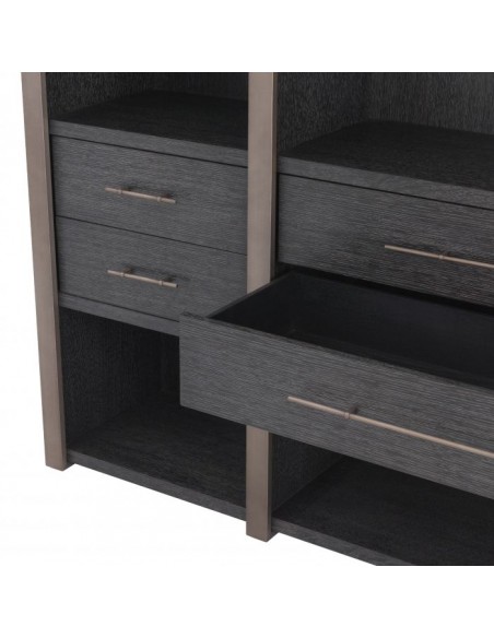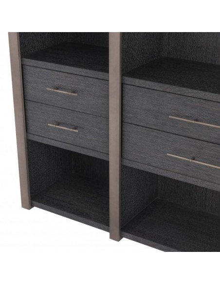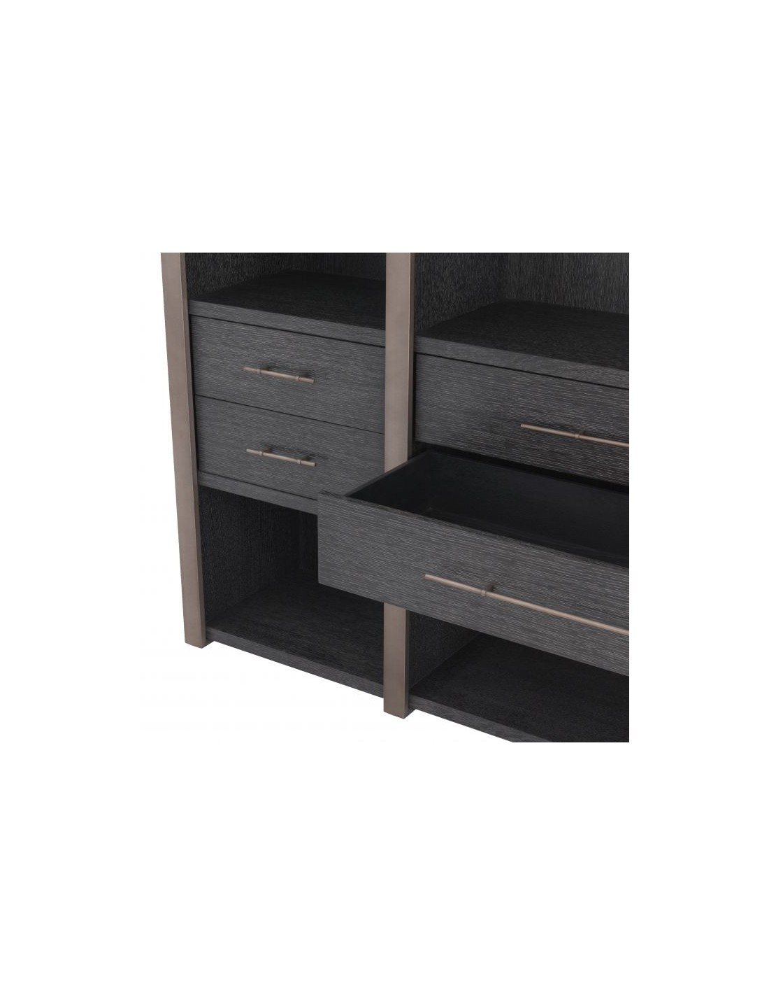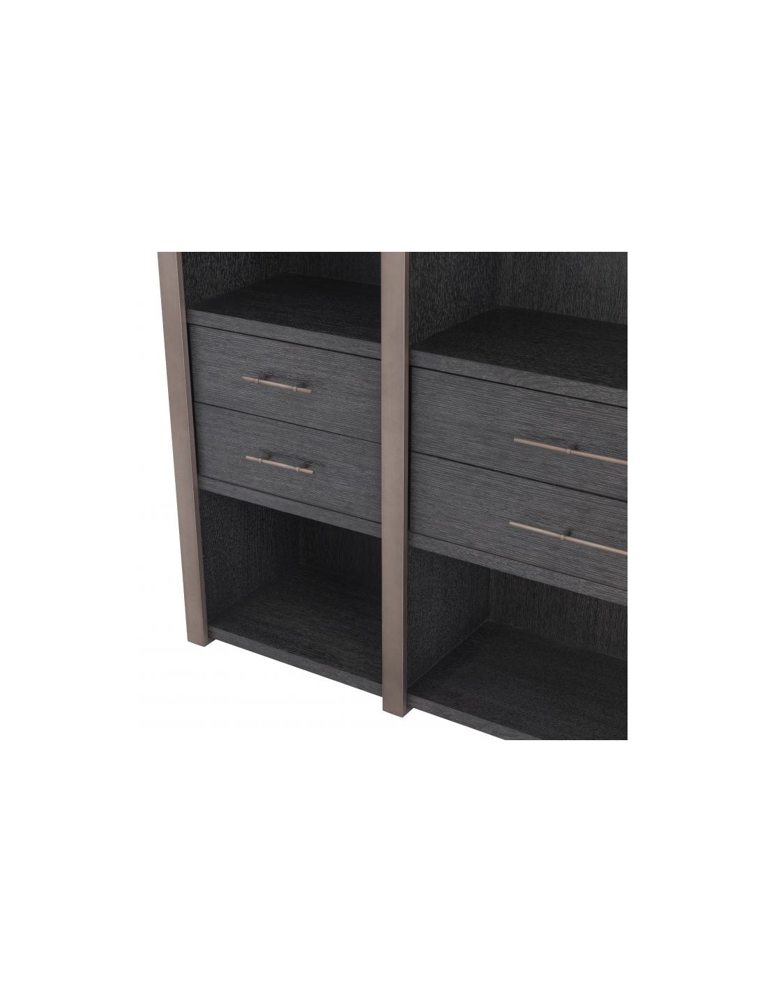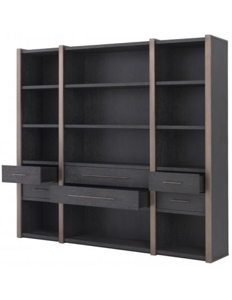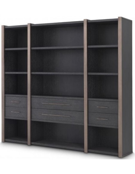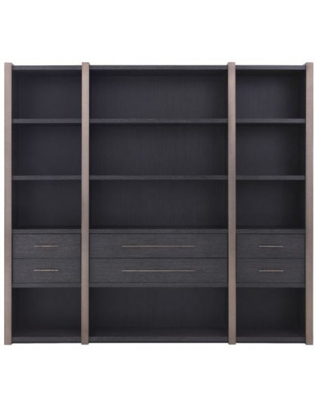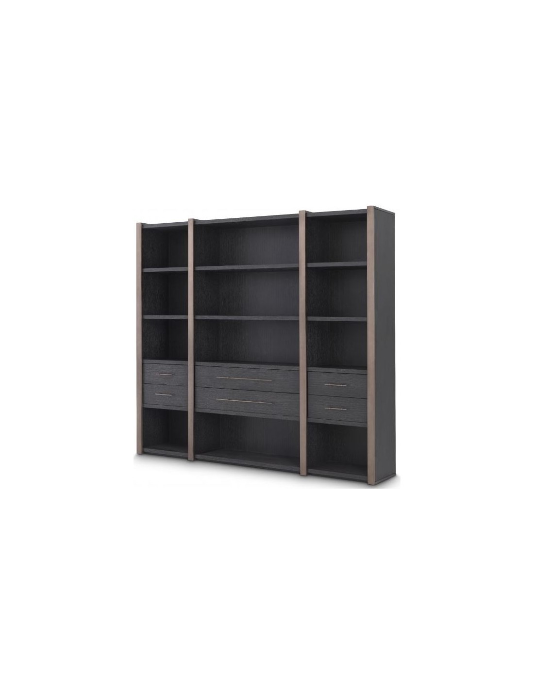 Eichholtz Canova reol eller reolvæg, udført i et moderne design af kulgrå egetræsfinér og bronzelakeret messing. Reolen måler 229 cm i højden og 253 x 47 cm i bredde og dybde. Reolen indeholder 12 hylderum og 6 skuffer.