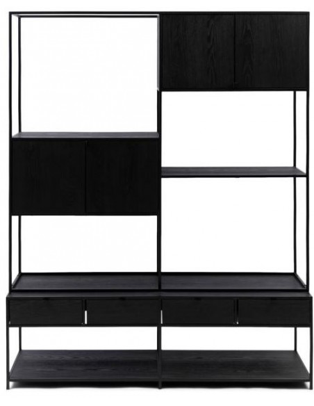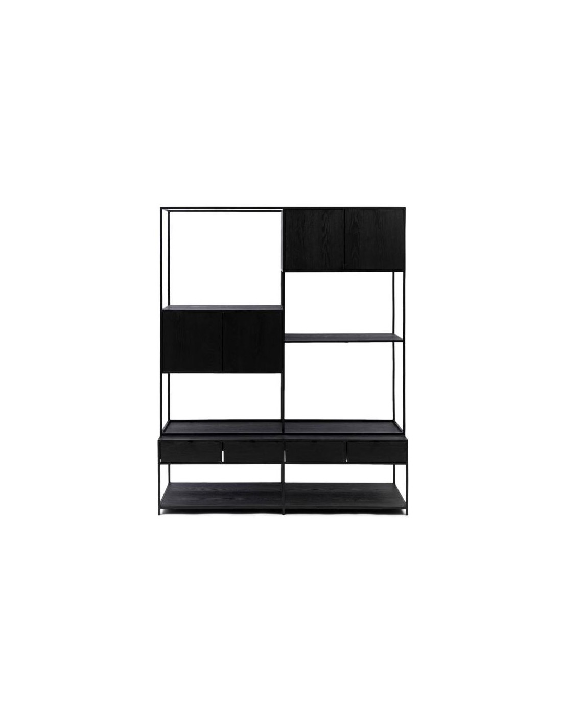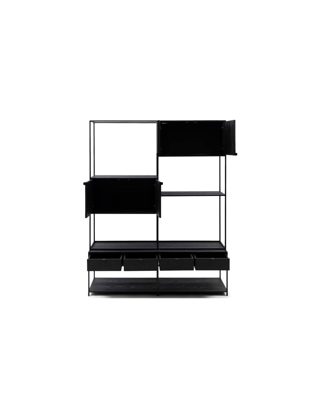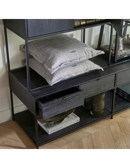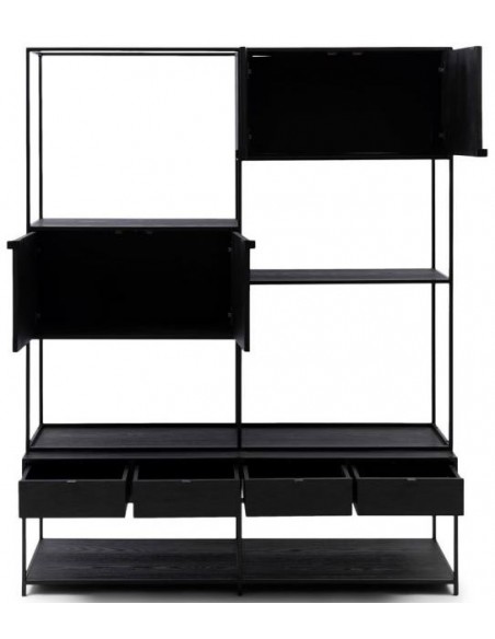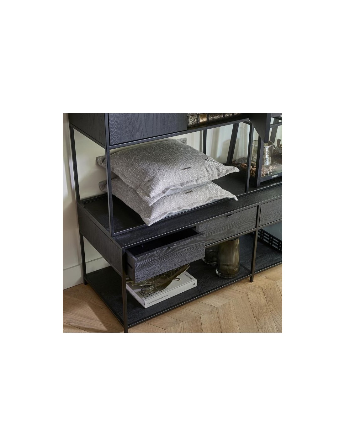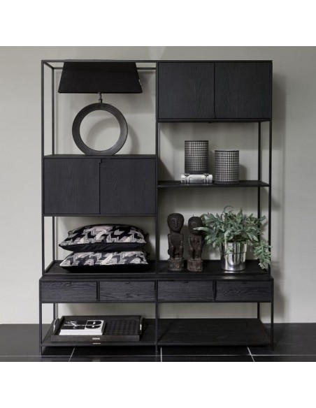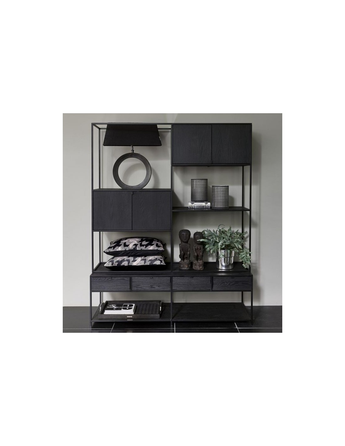 Riviera Maison reolvæg, udført i et design af sortlakeret stål og egetræ. Reolen måler 200 cm i højden og 160 cm i bredde og dybde og kommer med både skuffer, skabe og hylderum.