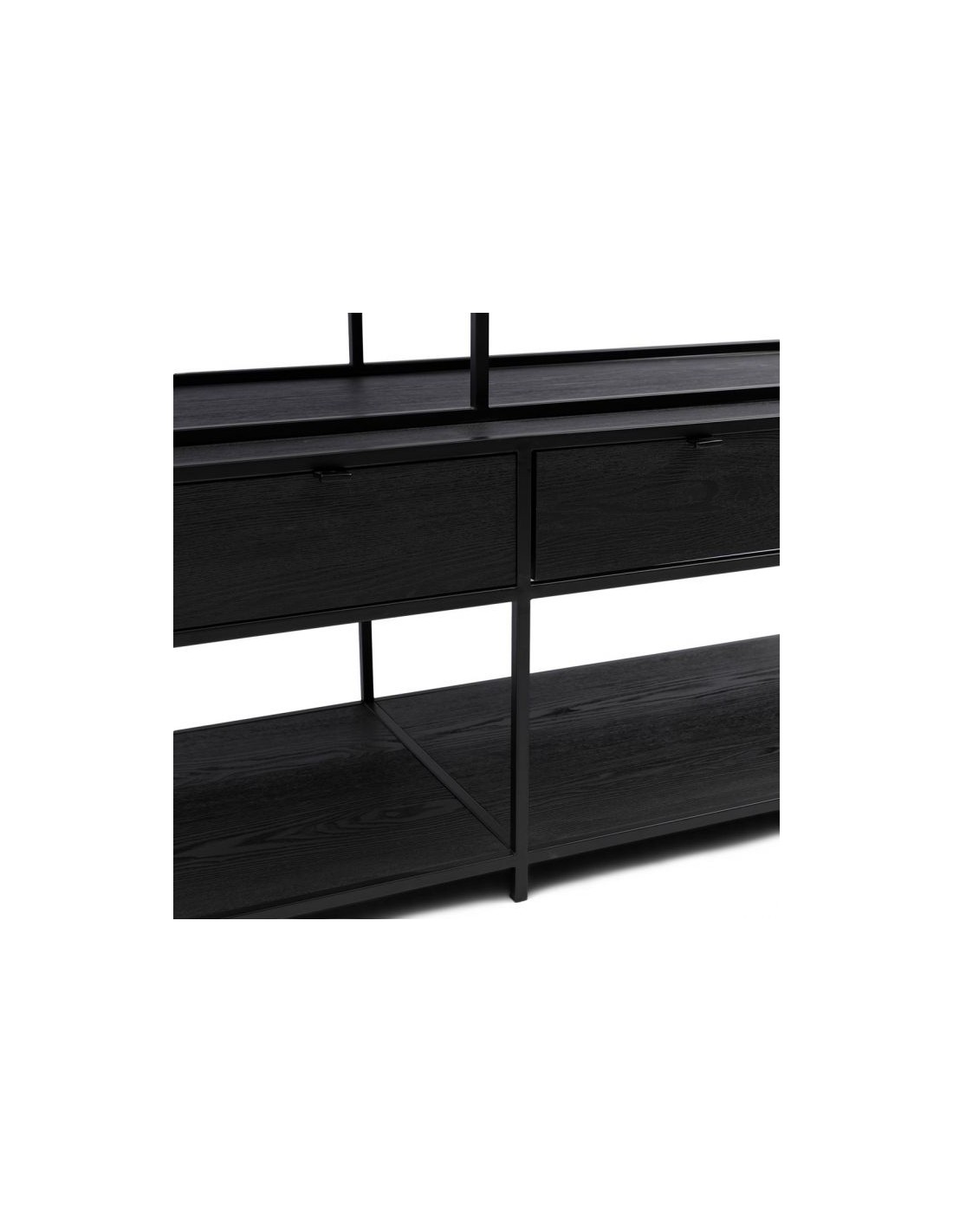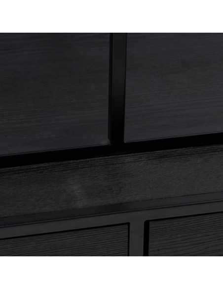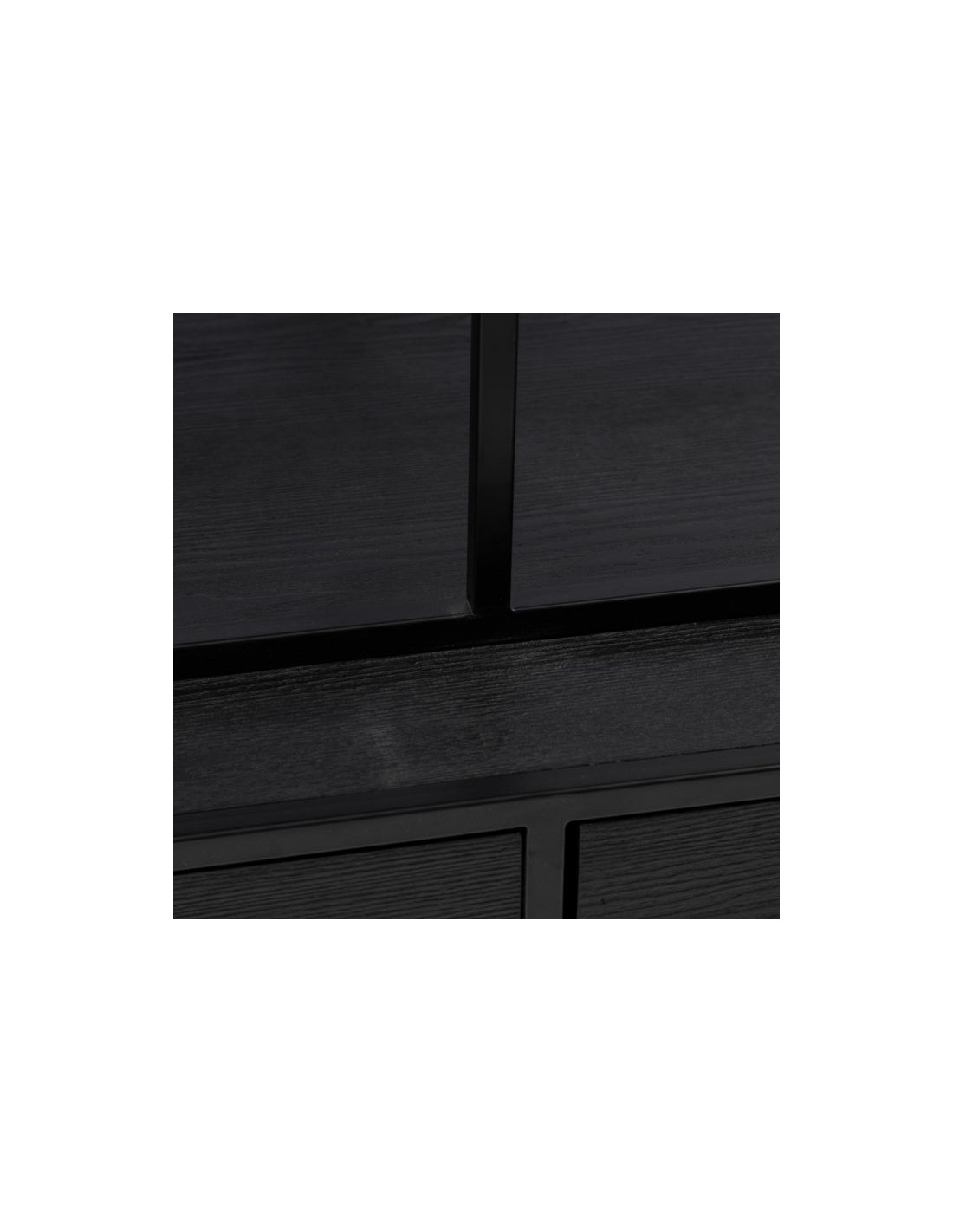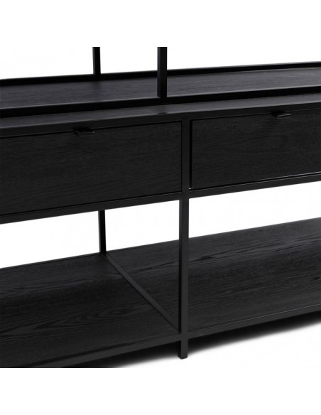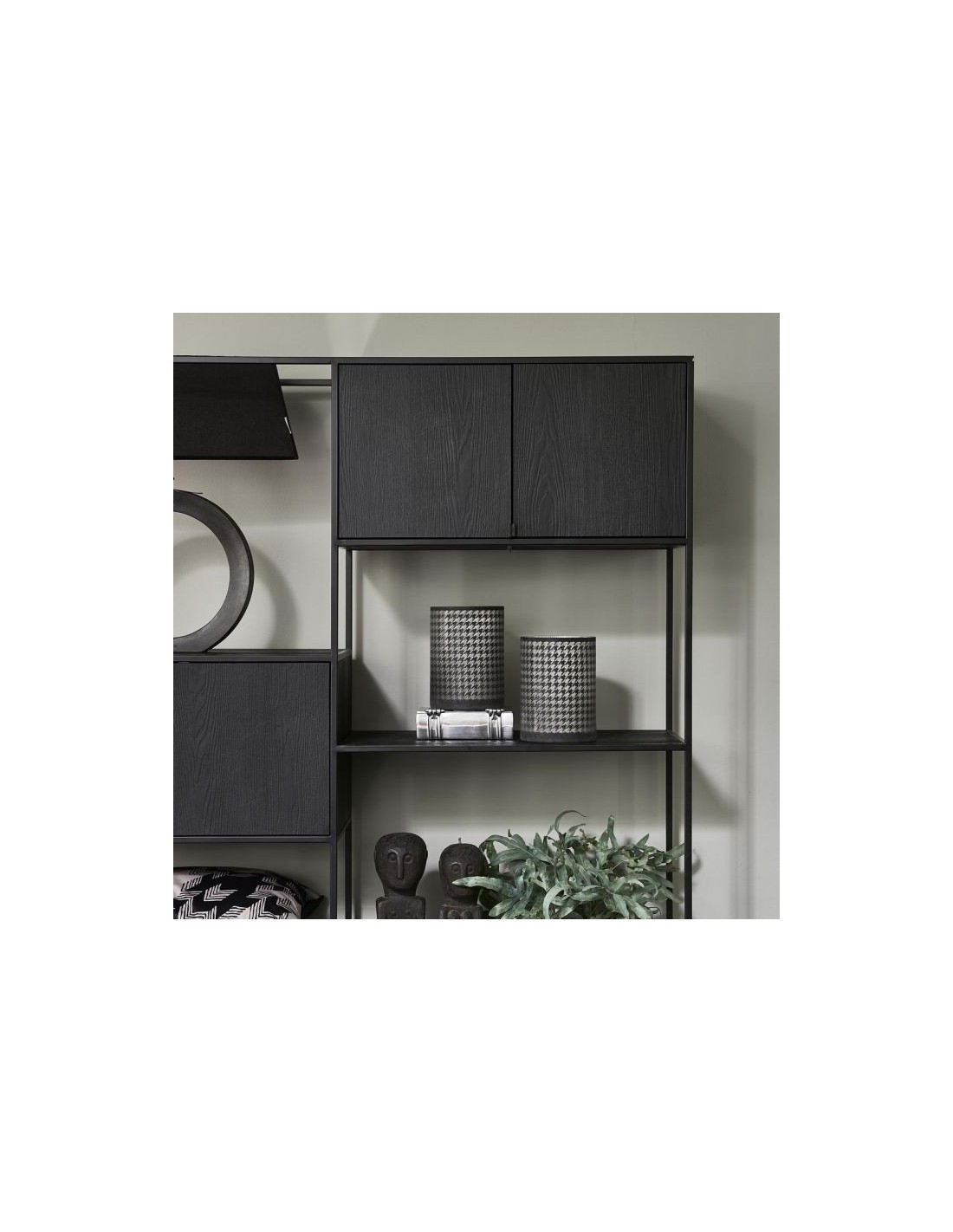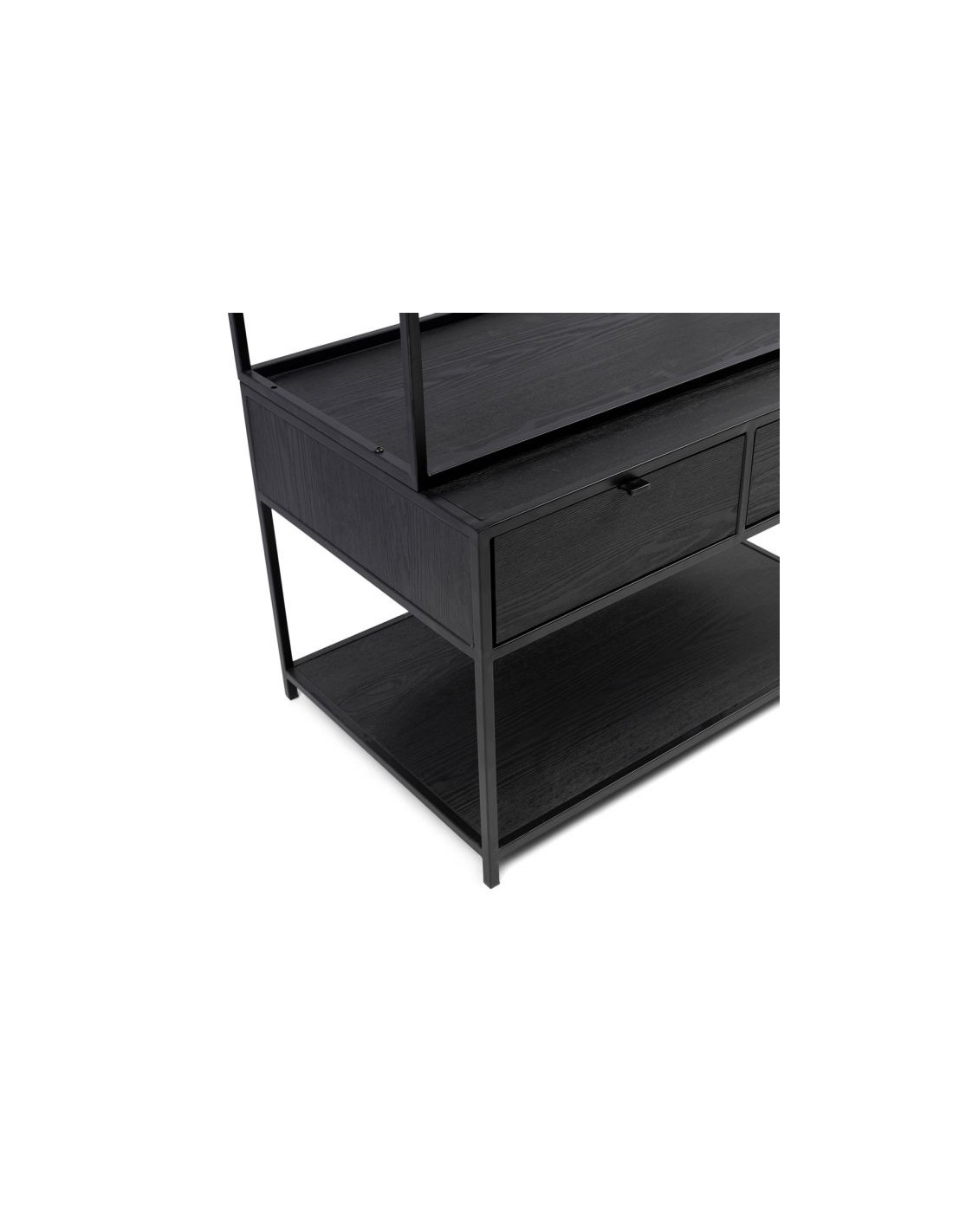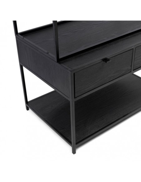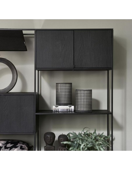 Riviera Maison reolvæg, udført i et design af sortlakeret stål og egetræ. Reolen måler 200 cm i højden og 160 cm i bredde og dybde og kommer med både skuffer, skabe og hylderum.