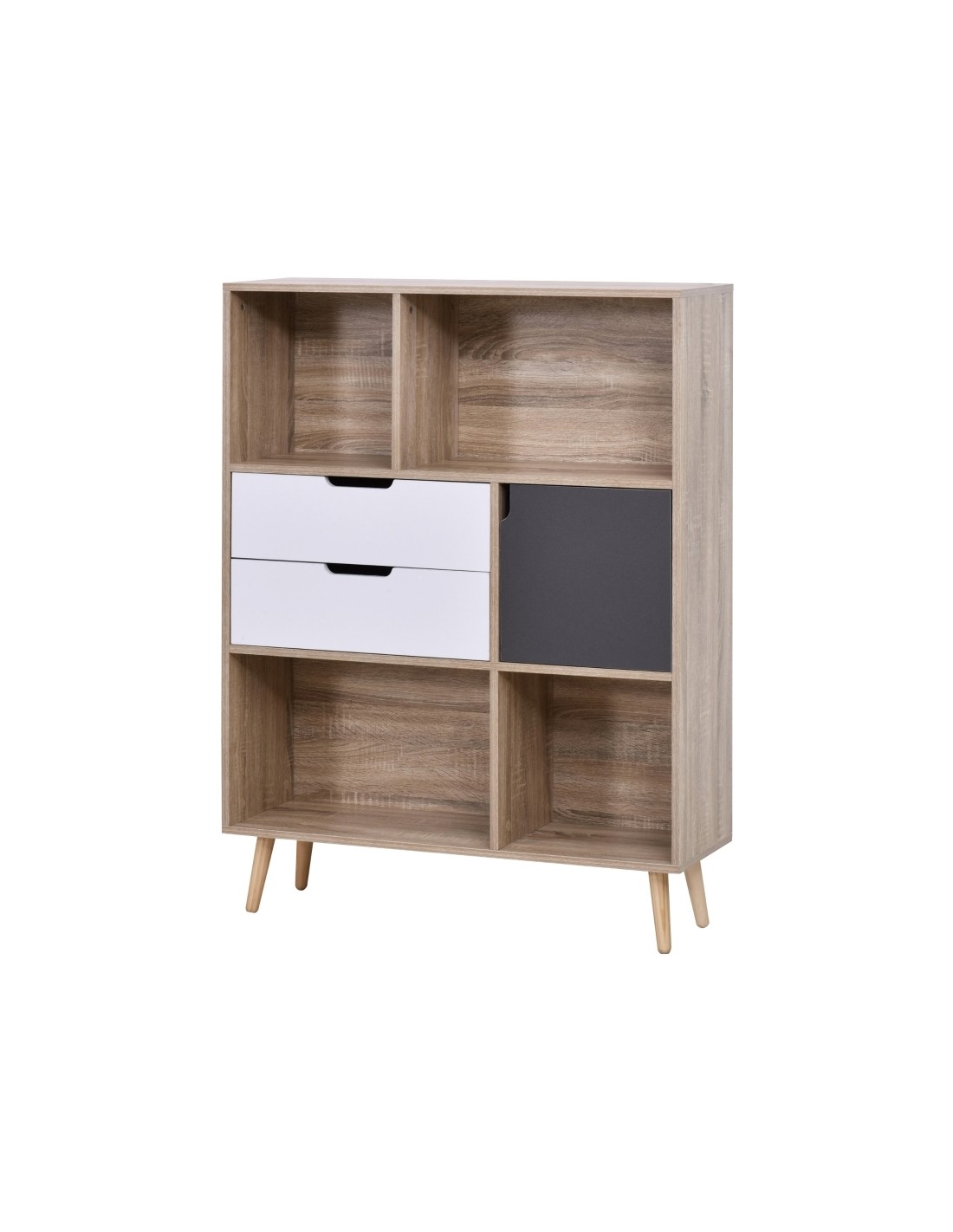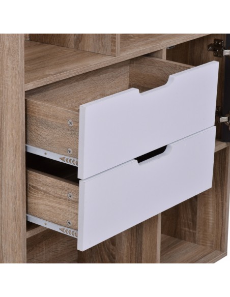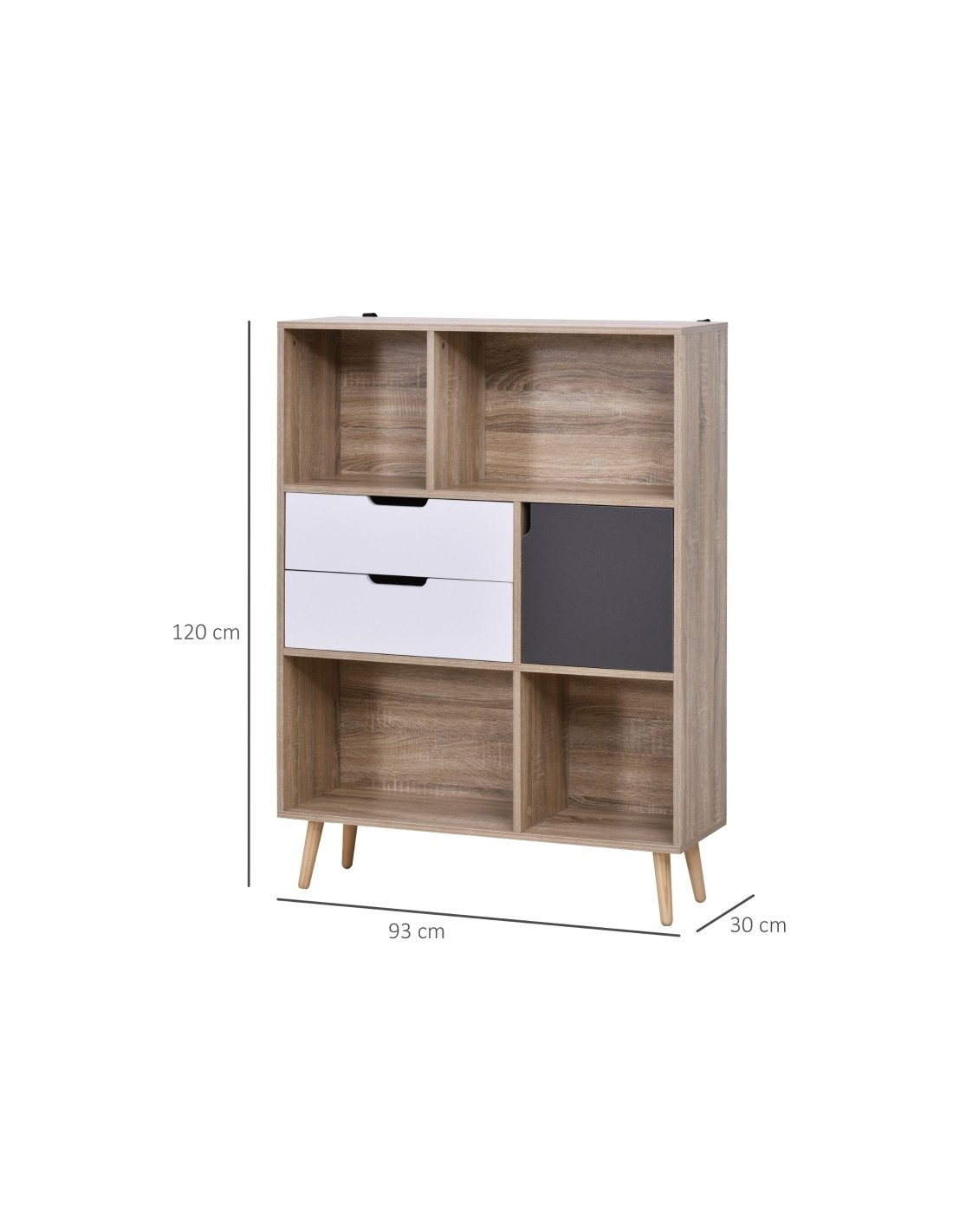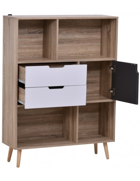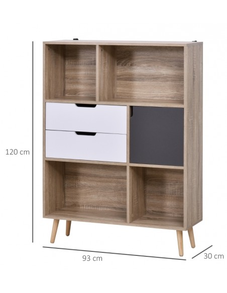 Reol udført i et design af møbelplade. Reolen måler 93 x 30 cm i bredde og dybde og 120 cm i højden. Reolen indeholder 1 skab, 2 skuffer og 4 åbne hylderum.