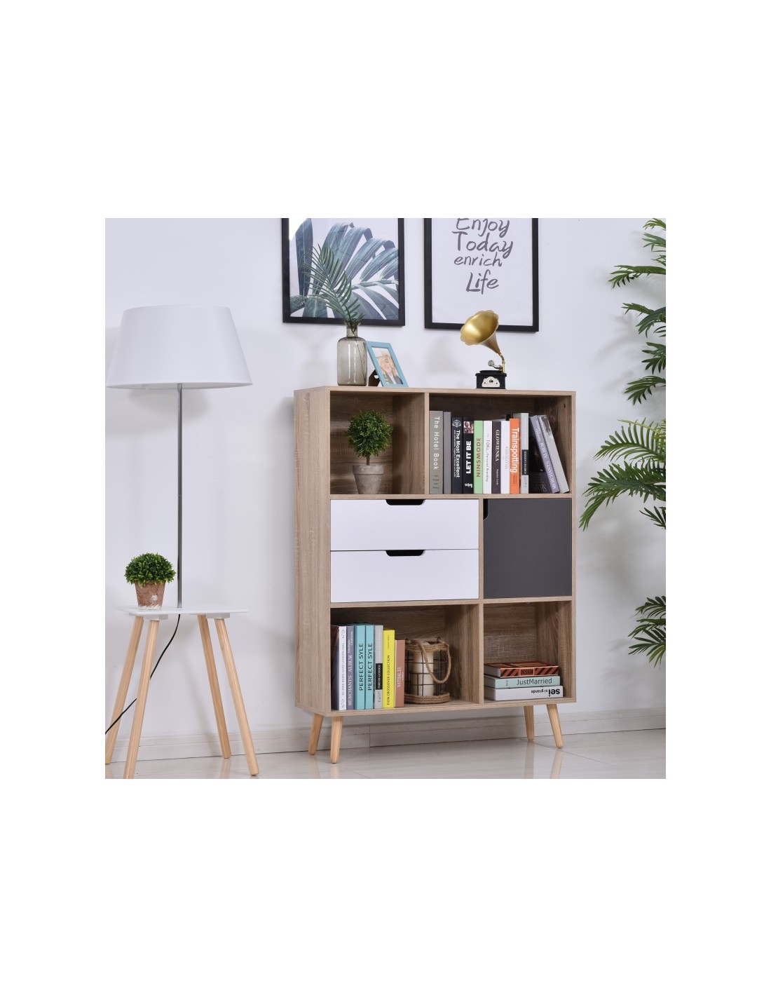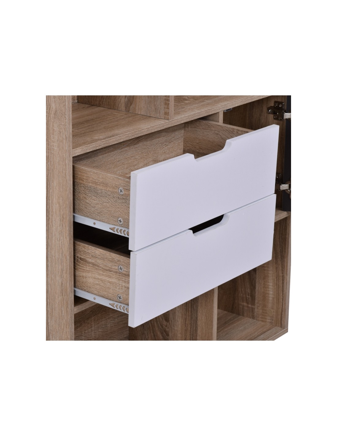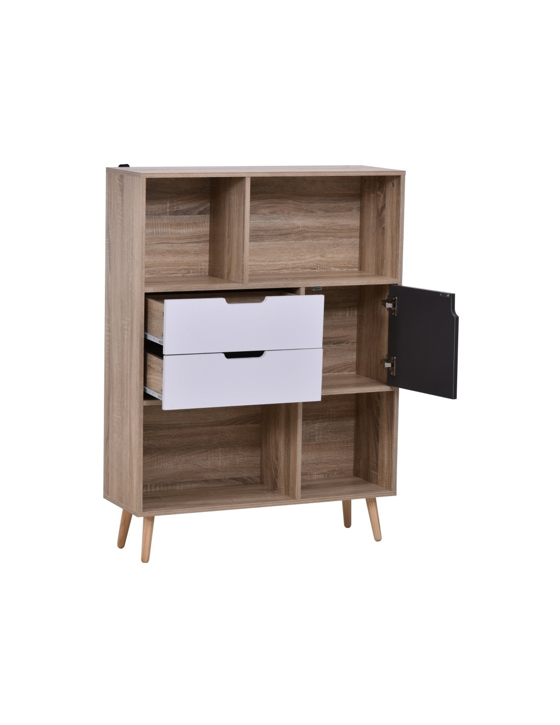 Reol udført i et design af møbelplade. Reolen måler 93 x 30 cm i bredde og dybde og 120 cm i højden. Reolen indeholder 1 skab, 2 skuffer og 4 åbne hylderum.