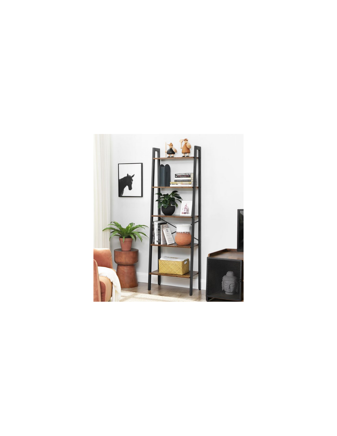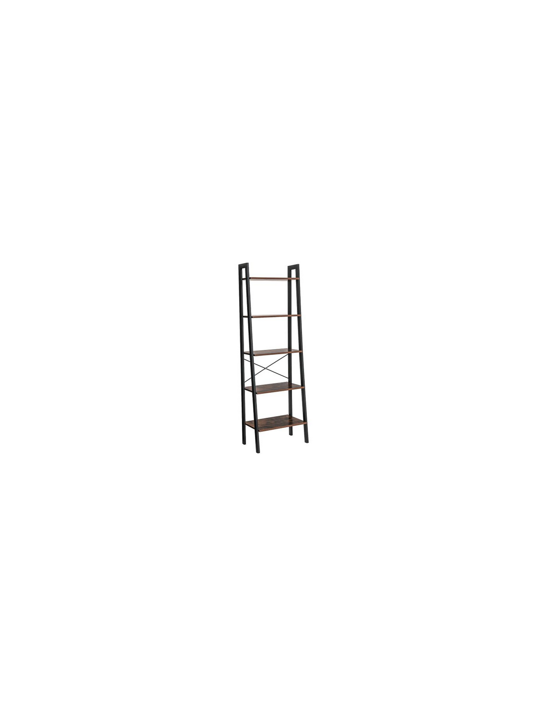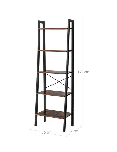 Reol udført i et design af sortlakeret metal og brun møbelplade. Reolen måler 172 cm i højden og 66 x 34 cm i bredde og dybde.