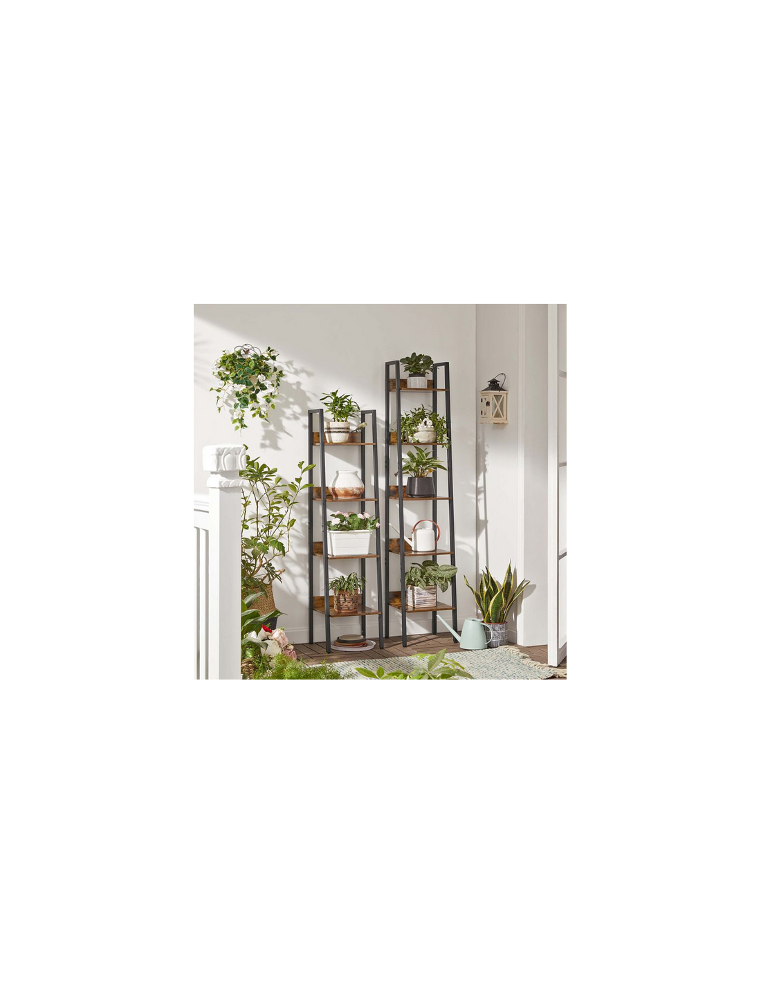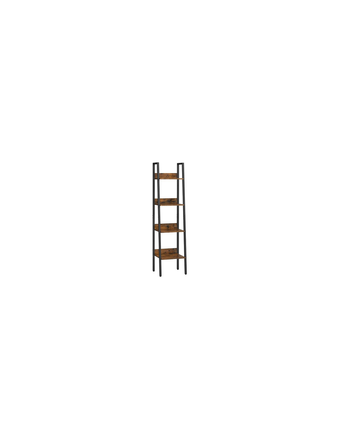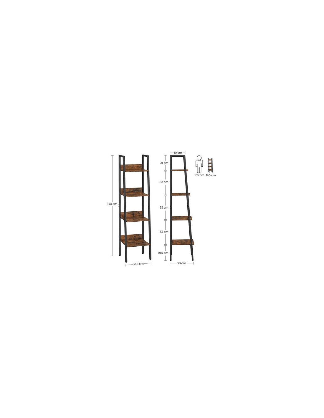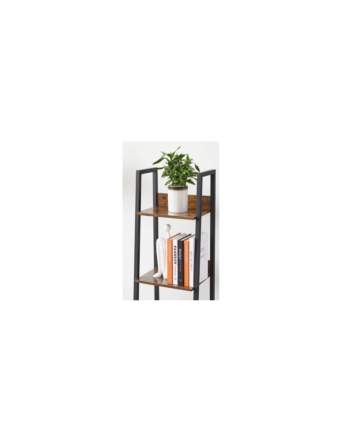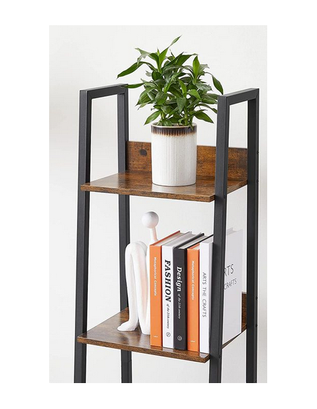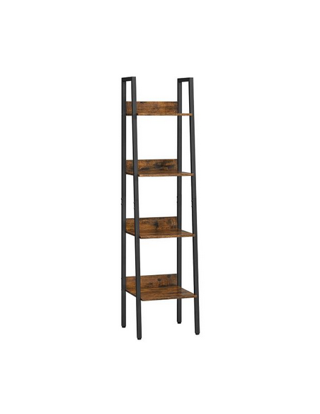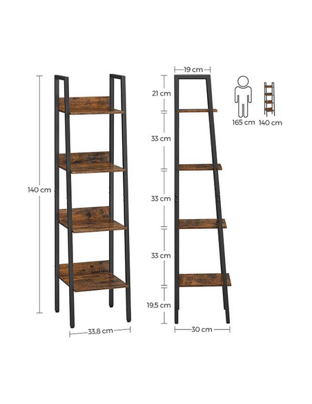Reol udført i et design af sortlakeret metal og brun møbelplade. Reolen måler 140 cm i højden og 33,8 x 30 cm i bredde og dybde.